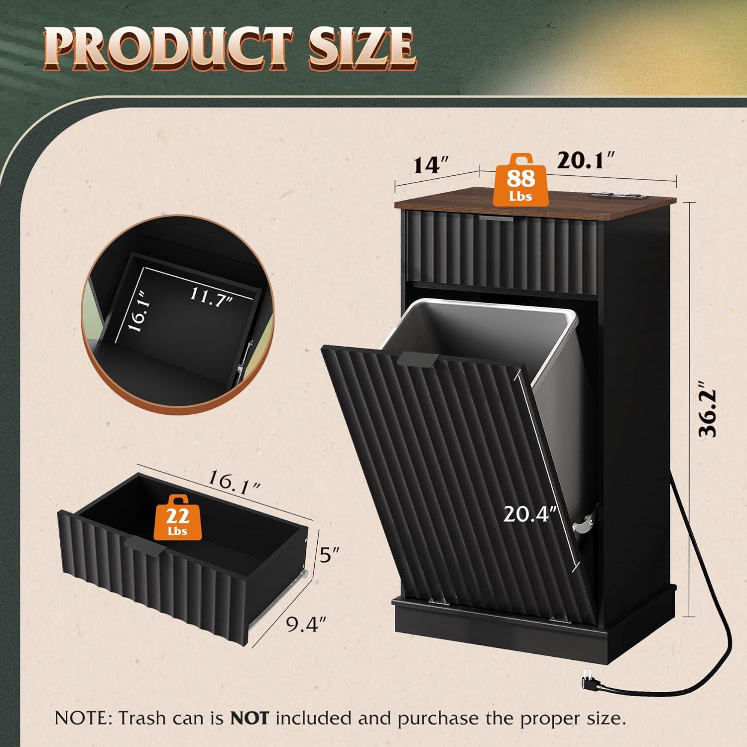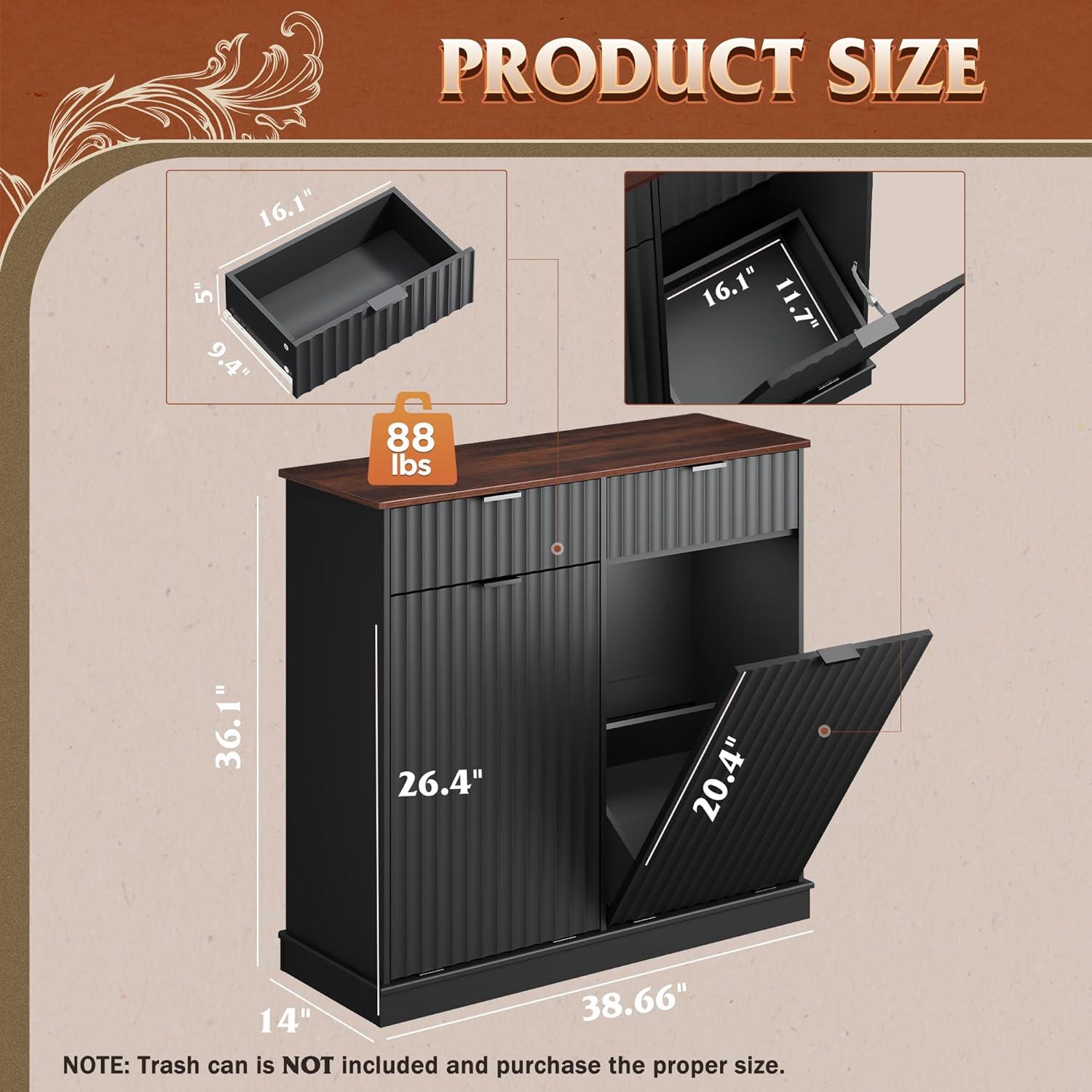 【Ample Storage Capacity】This trash can cabinet features a spacious pull-out drawer(16.1″×9.4″×5″) and a 10-gallon main compartment(16.1″×11.7″×20.4″), designed to fit a 10-gallon trash bin. Perfect for organizing kitchen waste, pet food, laundry, or recycling. NOTE: The trash can is NOT included.
