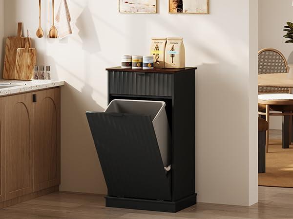 【Durable & Safe Construction】Crafted with thickened MDF panels and reinforced metal hinges, our tilt-out trash cabinet supports up to 88 lbs—far exceeding industry standards. Compliant with CARB P2 regulations, it ensures safety and longevity for daily use.
