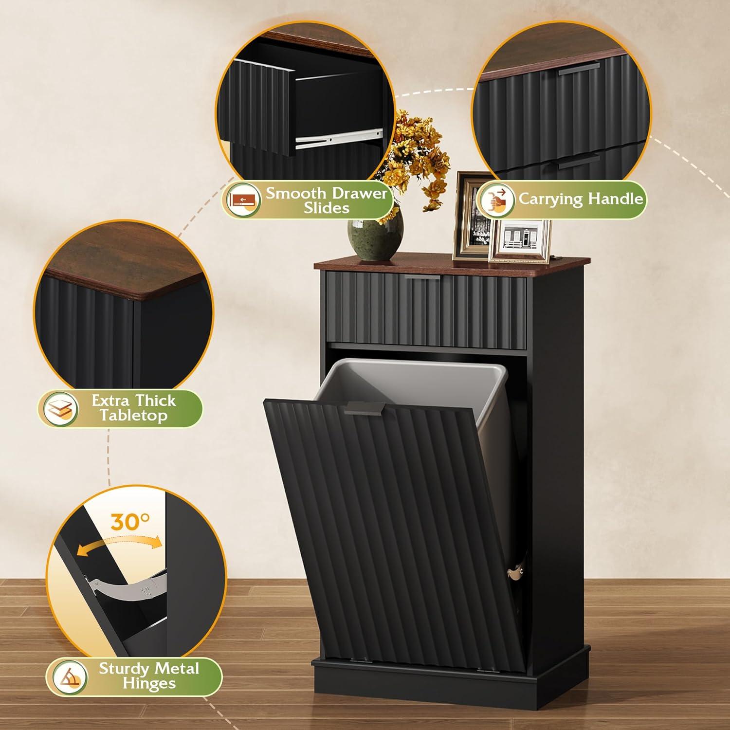 【Smooth & Effortless Operation】Experience premium functionality with a dual-mechanism design: The tilt-out trash cabinet door opens smoothly at a 30° angle, supported by 50,000-cycle tested metal hinges. Plus, the drawer glides effortlessly on full-extension metal runners, ensuring buttery-smooth access to your stored items without any resistance.