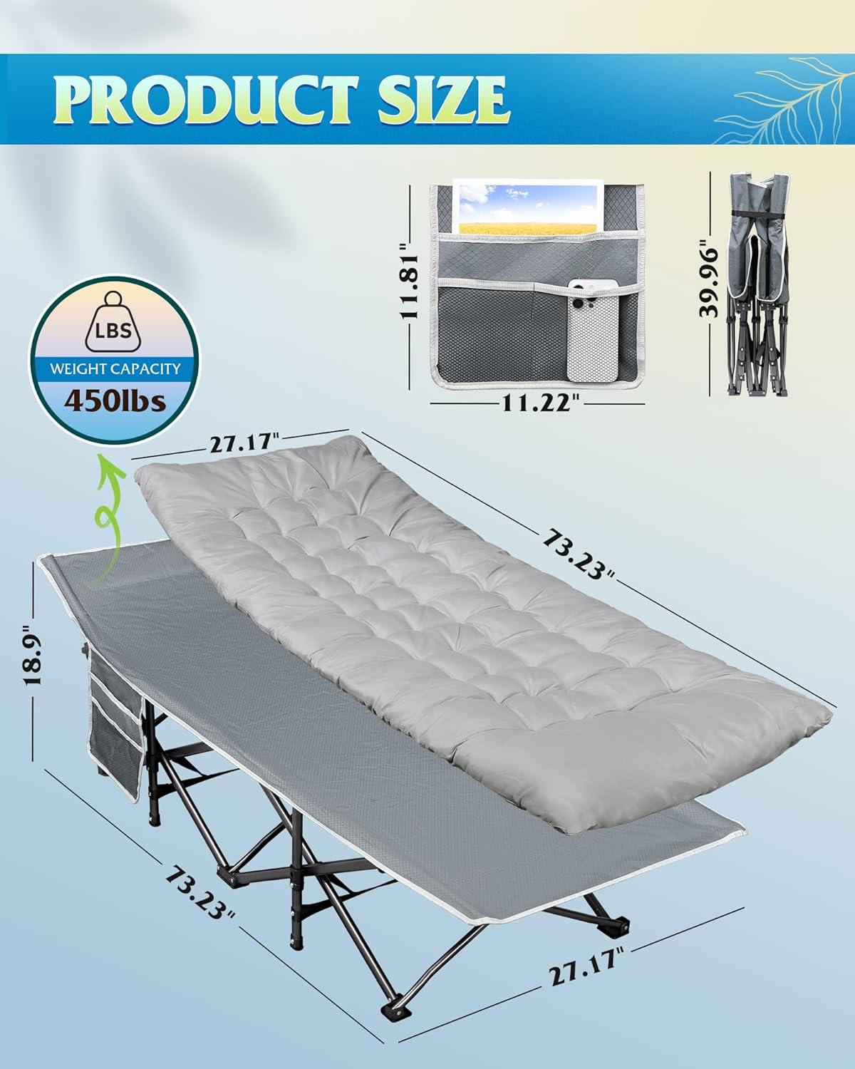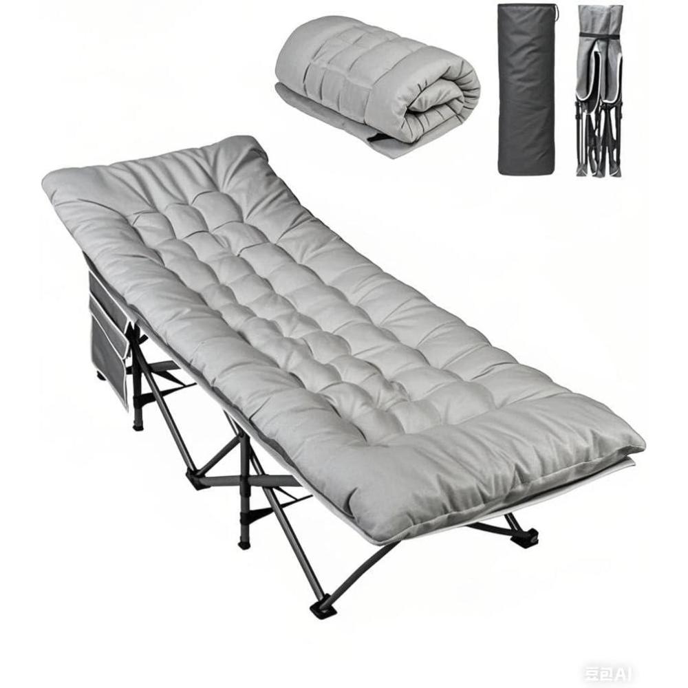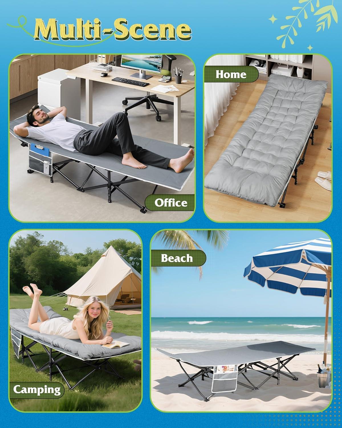 【Multi-Use Design】Our capm bed is equipped with a side pocket to keep essentials like phones, glasses, or drinks handy, making it an amazing choice for camping, office naps, or as a folding bed for sleeping.