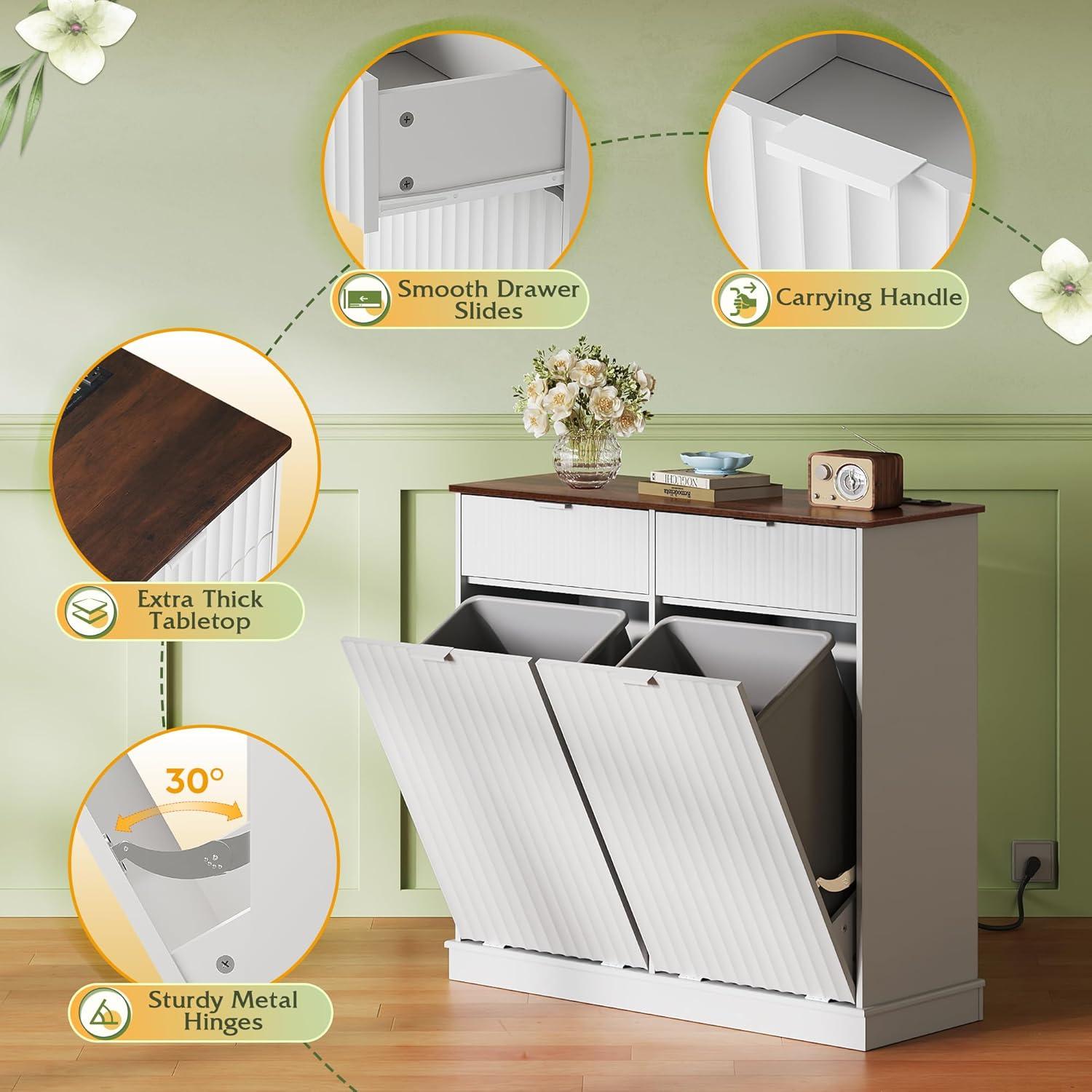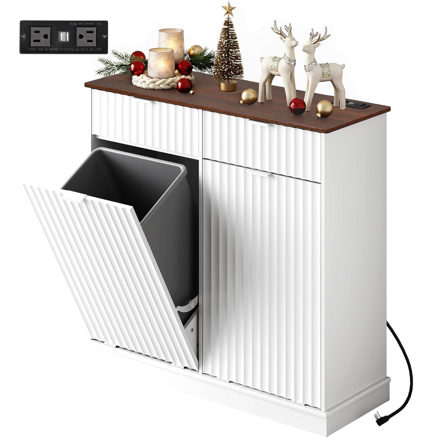 WLIVE 2 * 10 Gallon Double Tilt Out Trash Can Cabinet, Hidden Trash Can Cabinet with 2 AC+ USB Outlets, Storage Drawers, Food/Clothes Storage Pet Proof Kitchen Trash bin Cabinet for Home (Black)(White)