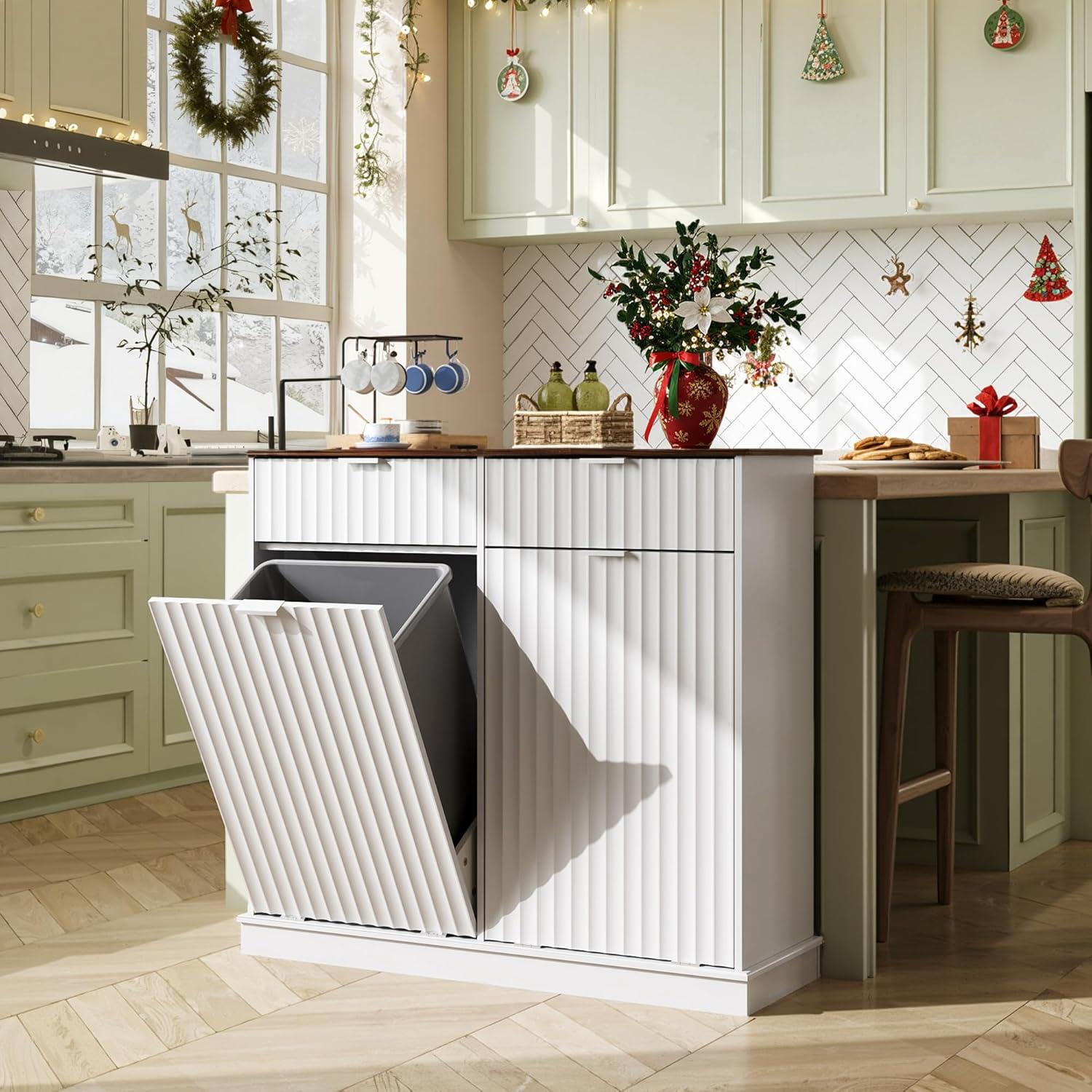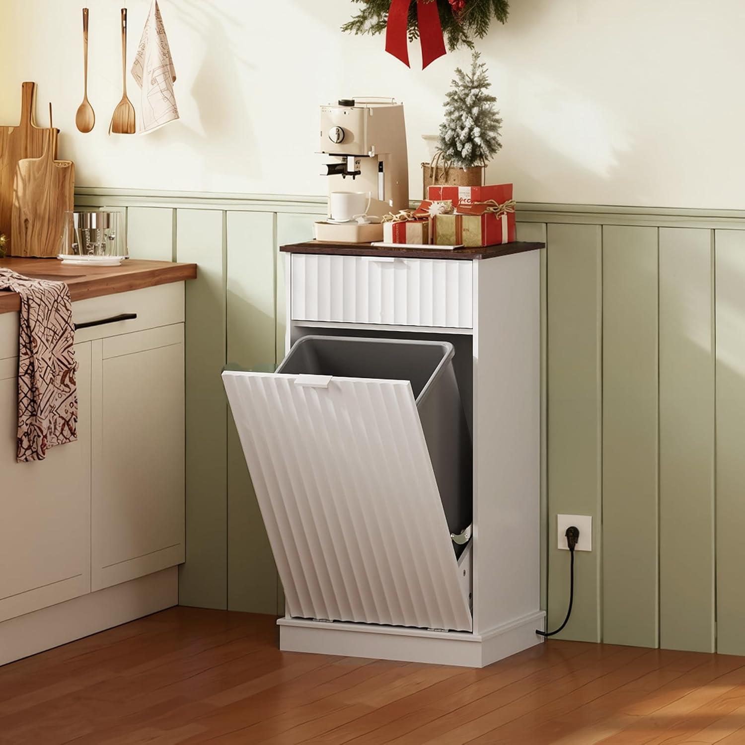 【Durable & Safe Construction】Crafted with thickened MDF panels and reinforced metal hinges, our tilt-out trash cabinet supports up to 88 lbs—far exceeding industry standards. Compliant with CARB P2 regulations, it ensures safety and longevity for daily use.