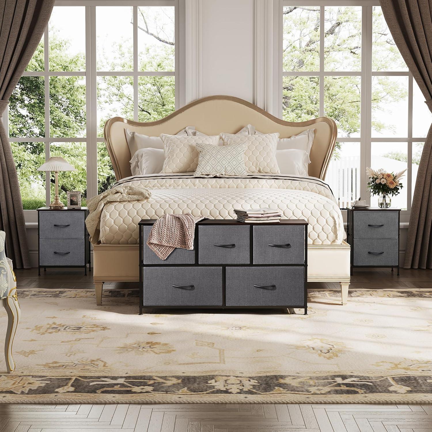 WLIVE 2-Drawer Nightstand with 2 and 5-Drawer Dresser Set, Fabric Storage Tower for Bedroom, Hallway, Nursery, Closets, Tall Chest Organizer Unit with Textured Print Fabric Bins, Steel Frame