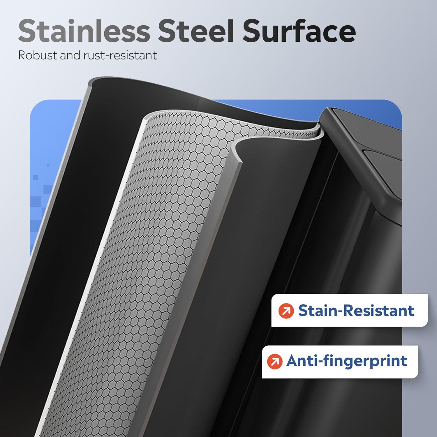 【Premium Stainless Steel Material】Engineered for lasting beauty and strength, our dual compartment kitchen trash cans are crafted from commercial-grade 410 stainless steel. This material provides exceptional rustproof strength, scratch resistance, and a fingerprint-resistant finish that maintains its lasting luster with a simple wipe. Coupled with two polypropylene inner buckets that effectively repel stain, ensuring a clean and fresh kitchen environment.