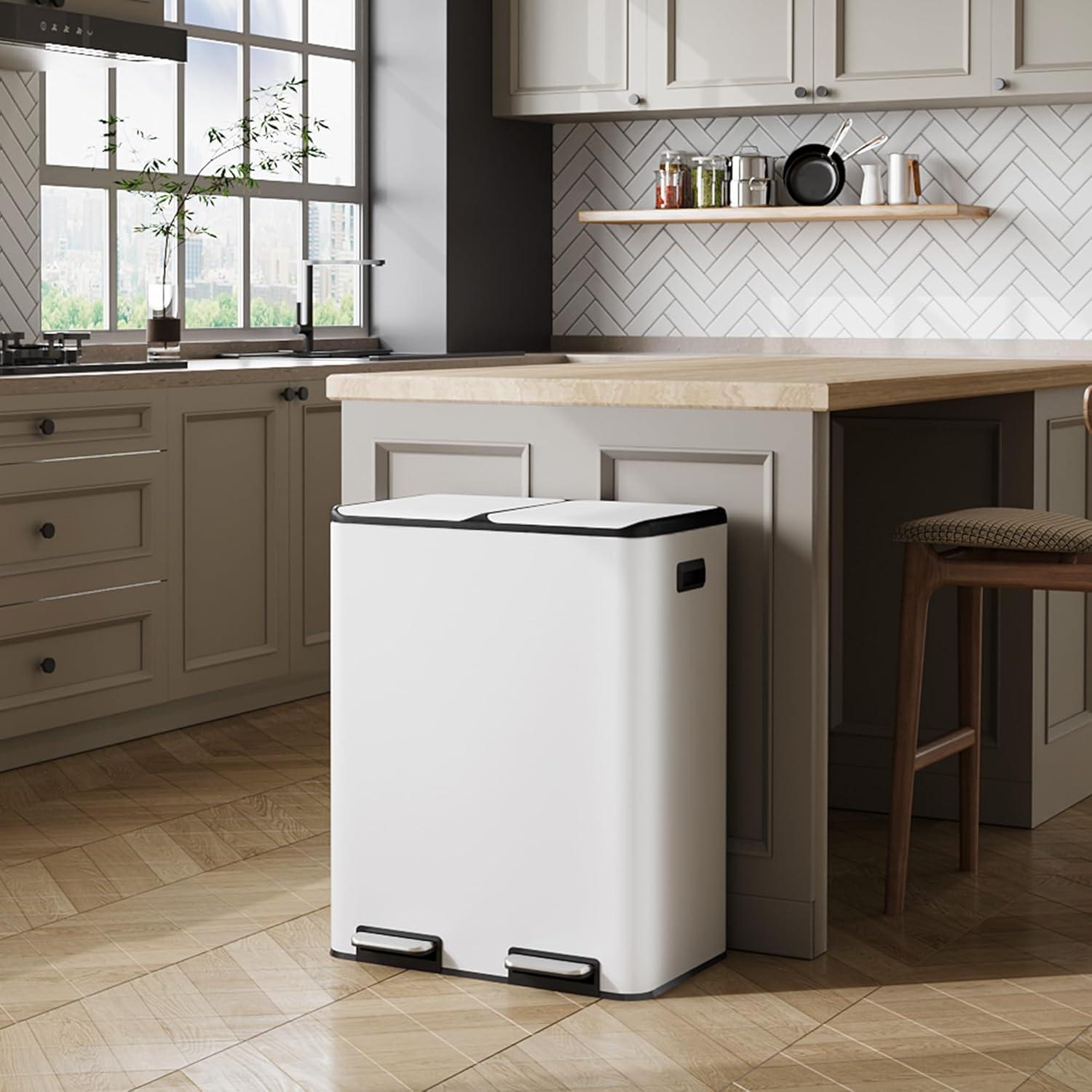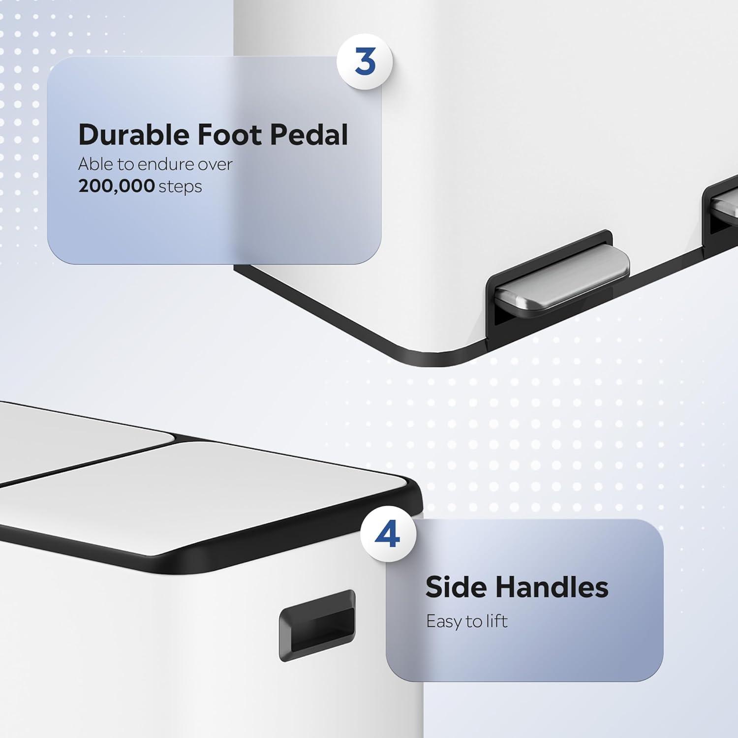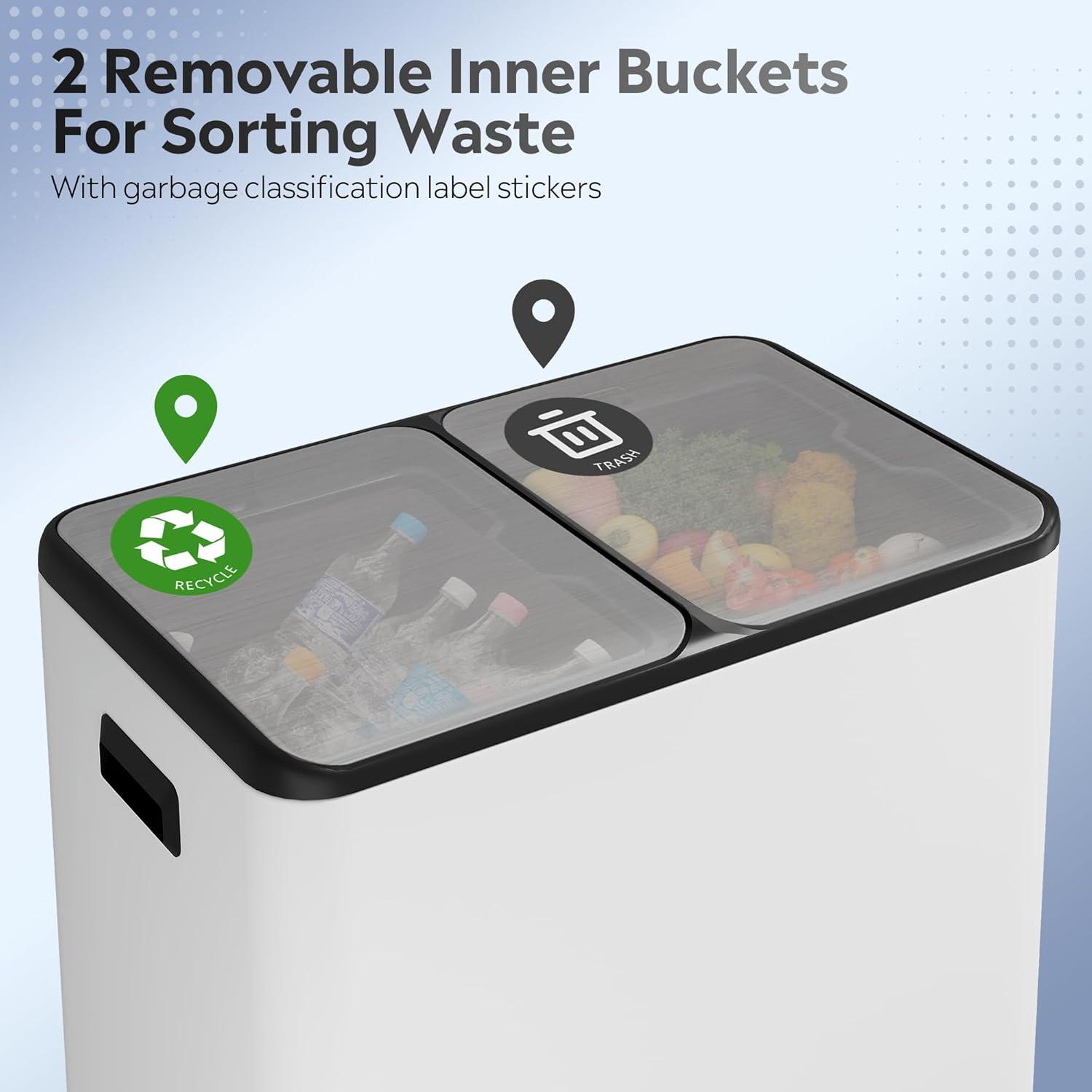 【Dual Compartment Design for Efficient Sorting】This kitchen trash can features two separate 8-gallon (30L) removable inner buckets with fixed slots and sorting stickers, making it easy to distinguish between trash and recyclables. Ideal as a recycle bins for kitchen, it maximizes space without clutter, supporting organized waste management in any home setup. *Tip: For best fit, use 27″+ length or 12+ gallon trash bags.*