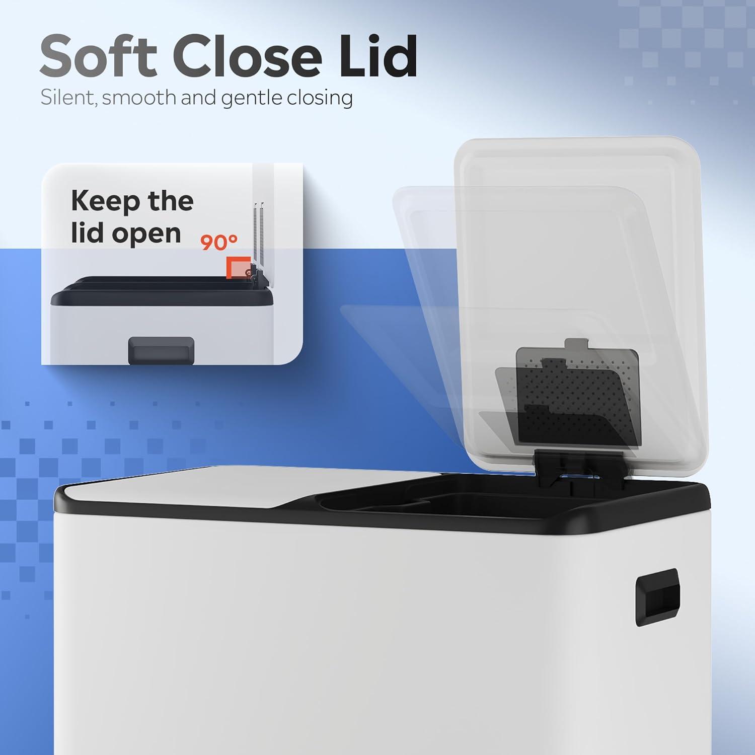 【Quiet Soft-Close Lid Mechanism】Equipped with a dual soft-closing system, this kitchen trash can minimizes noise and extends lifespan by cushioning impacts. Additional rubber pads on the body further reduce sound, ensuring quiet operation in busy households.
