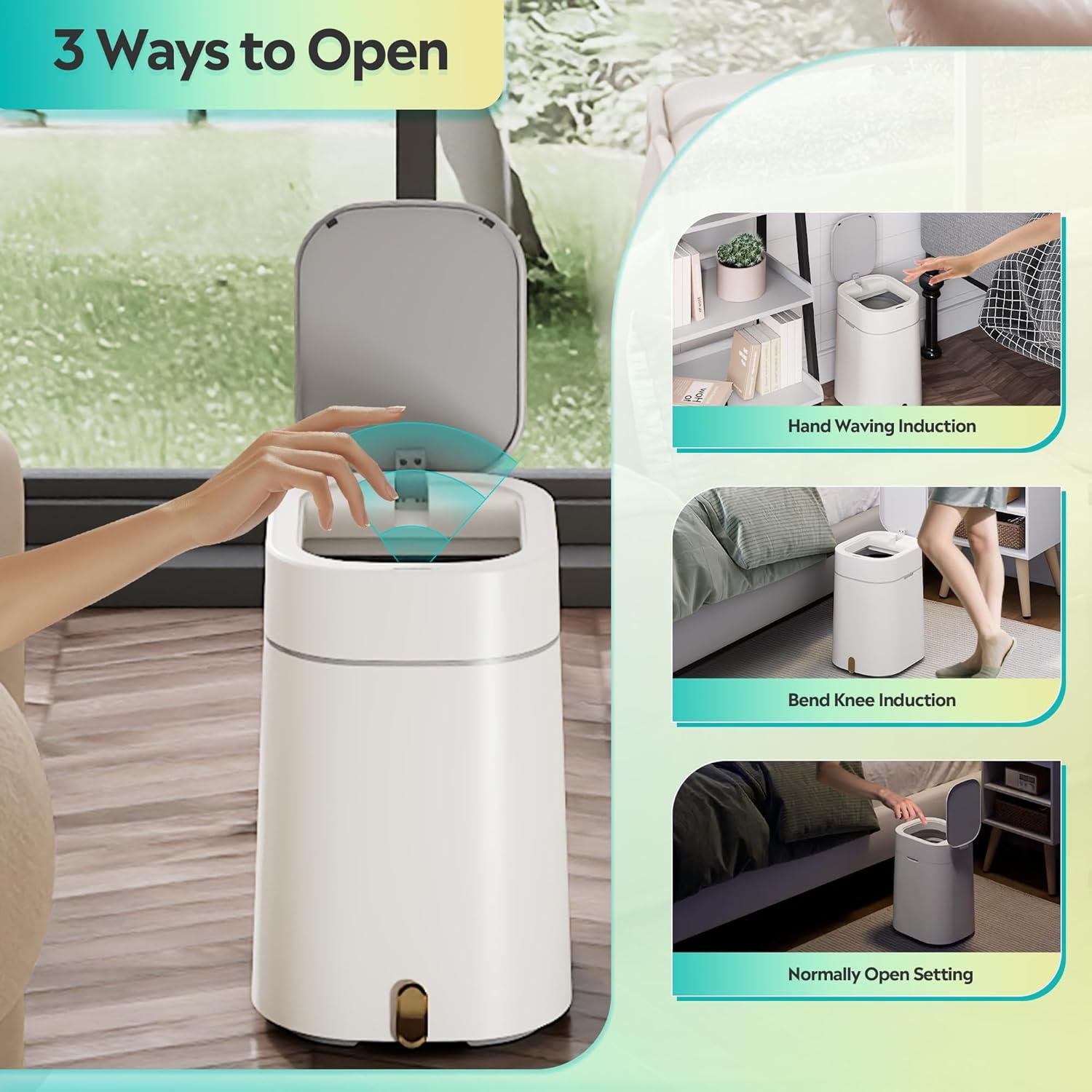 【Auto-Open & Hands-Free】This automatic trash can for bathroom features a sensitive infrared motion sensor, opening the lid in just 0.1s and auto close in 5s. Wave your hand or bend your knee for truly touch-free disposal. Also press the button to keep the trash opening or closed.