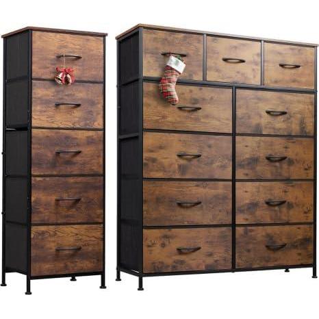 WLIVE 5 Drawer Dresser and 11 Drawer Dresser Set, Dresser for Bedroom, Closet, Hallway, Storage Dresser Organizer Unit, Dressers & Chests of Drawers with Fabric Bins, Rustic Brown Wood Grain Print