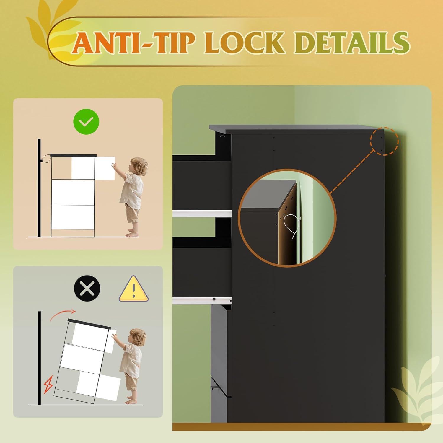 ✨【Safe and Sturdy】The bedroom dresser is crafted from durable engineered wood, ensuring long-term use and scratch resistance. Each wood drawer can hold up to 30lbs, and the wood tabletop can hold up to 88lbs. Equipped with an anti-tipping device, effectively preventing shaking or tipping over, keeping family members and pets safe