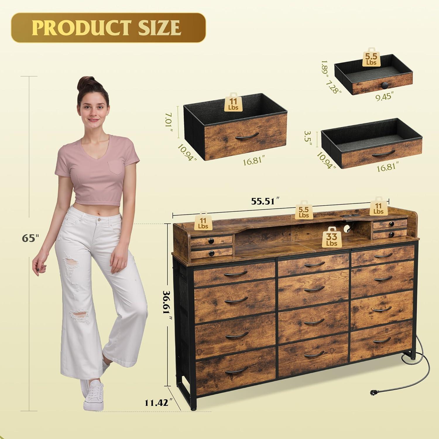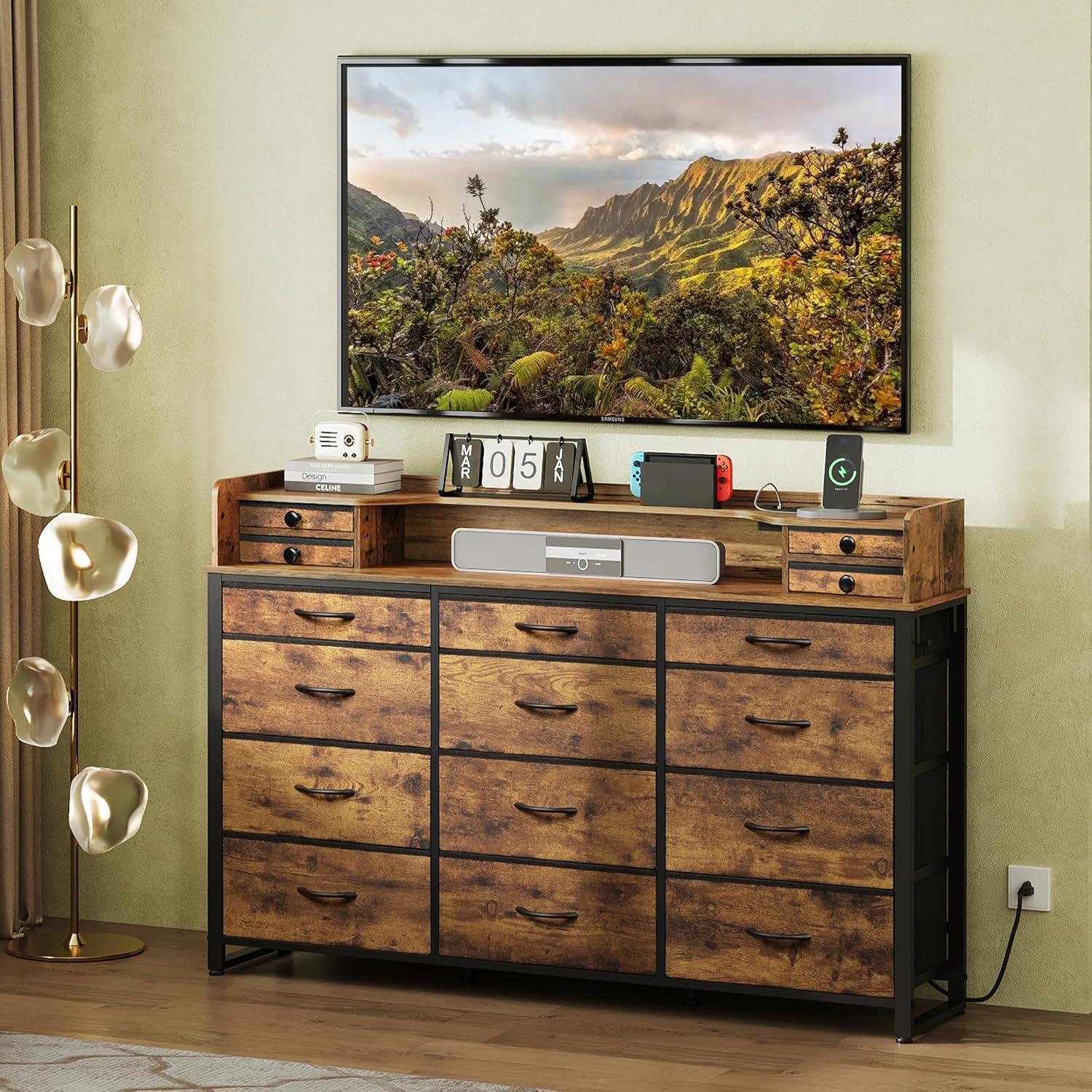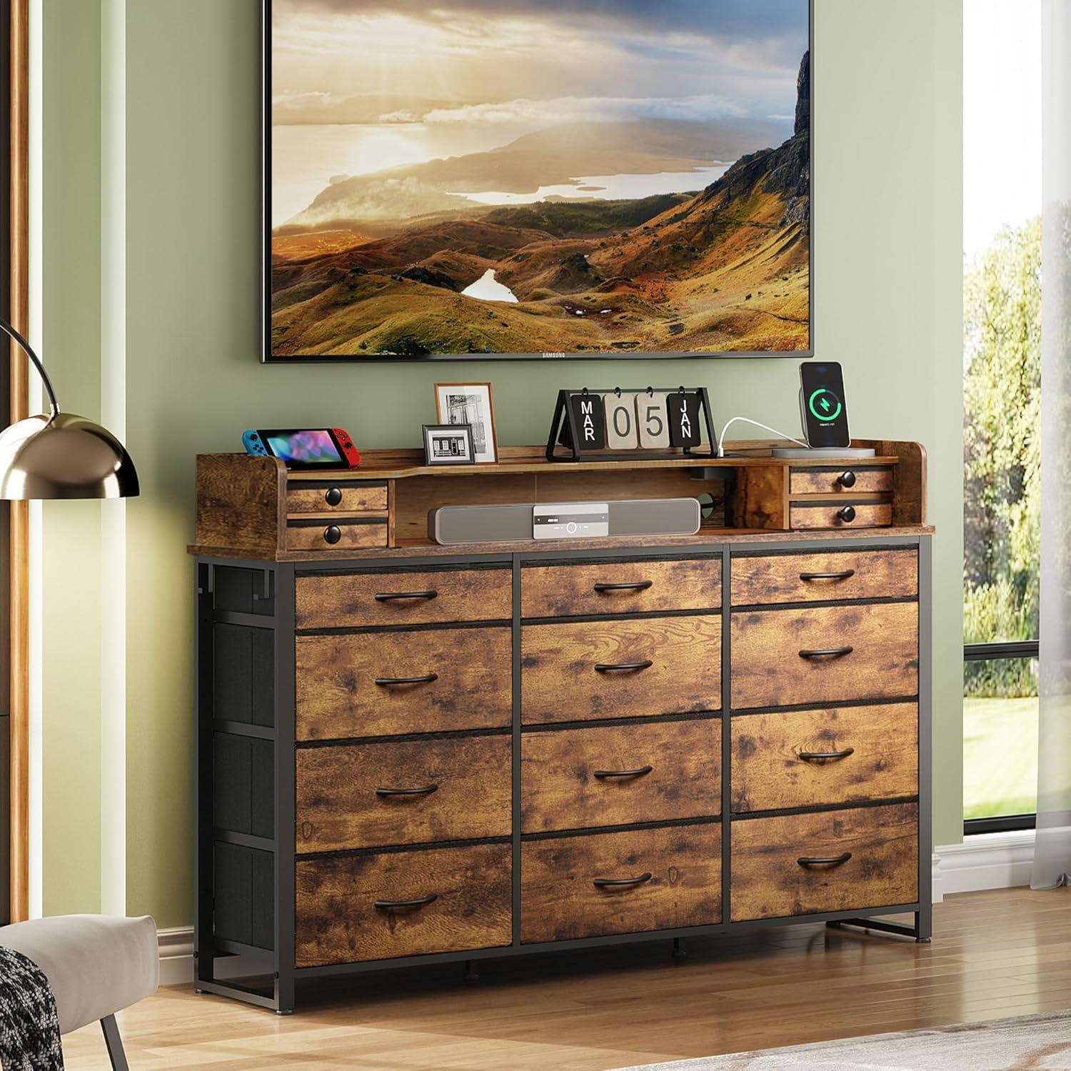 WLIVE 55''W Storage Organizer Unit with Charging Station, Black Storage Drawers Organizer with 16 Fabric Drawers & 3 Open Shelves, Large Storage Tower Organizaton for Living Room, Hallway, Office(Rustic Brown)