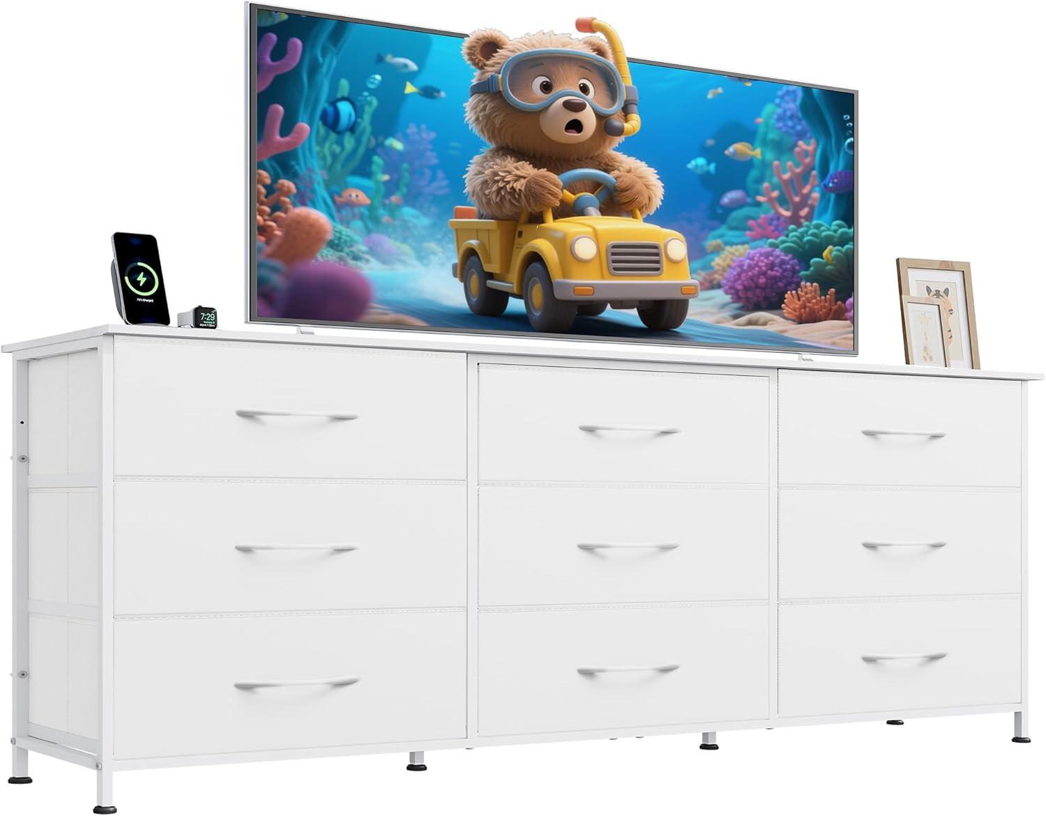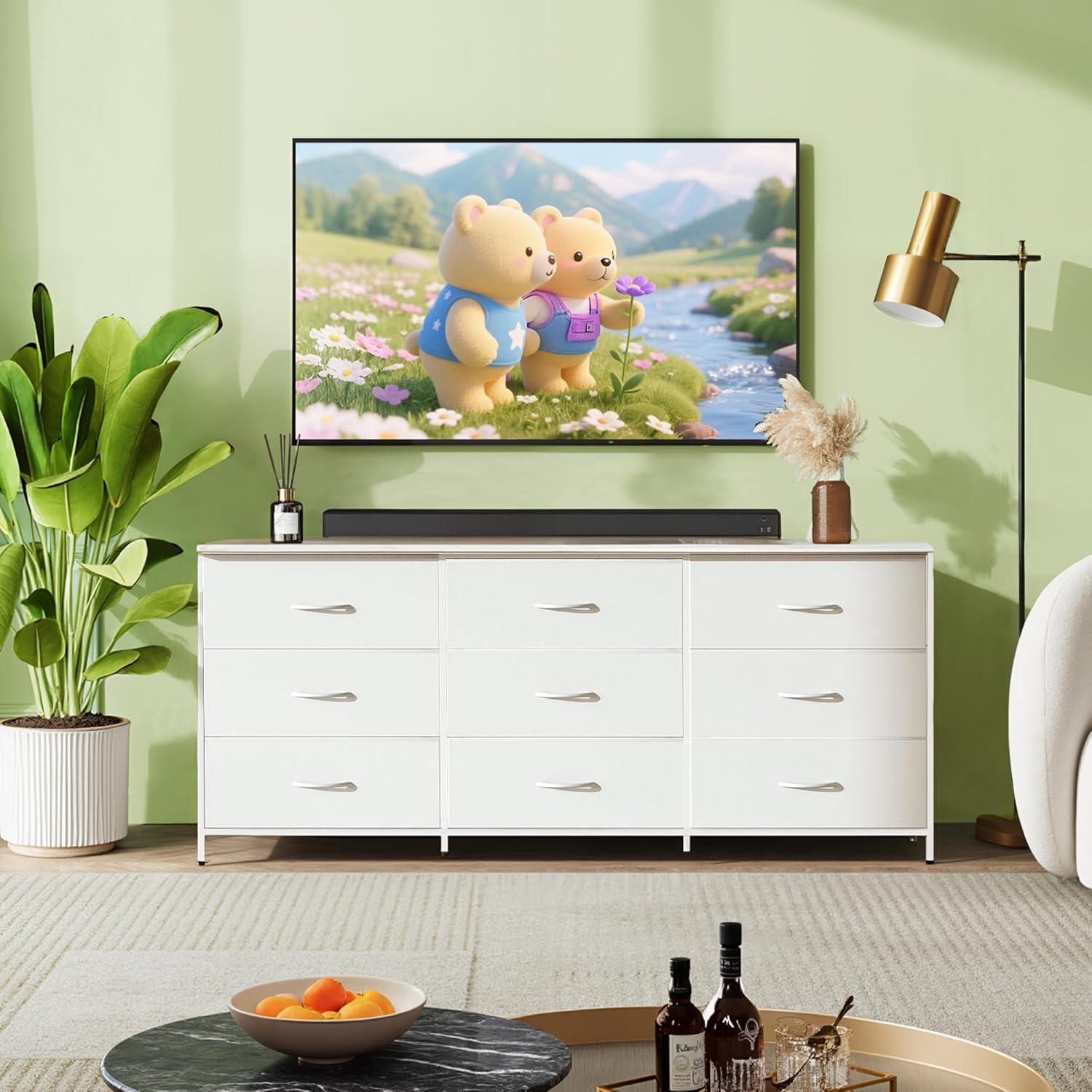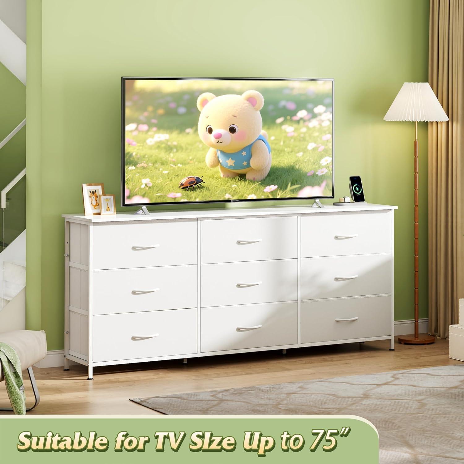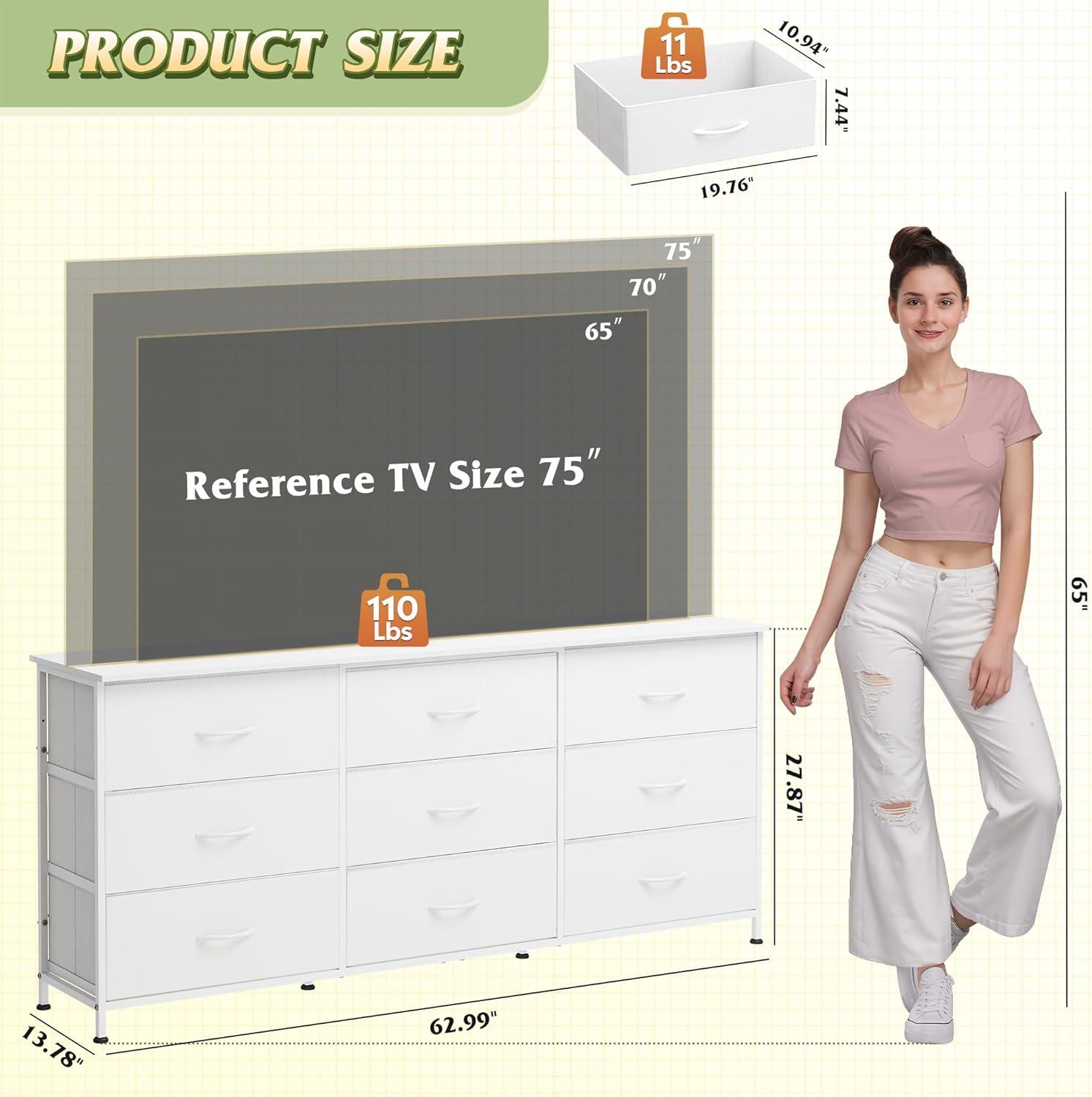 【🏠Ample Storage TV Stand】Measures 13.78″D x 62.99″W x 27.87″H, 75'' TV can be placed, our media console is equipped with 9 detachable fabric drawers and spacious woodtop, which facilitate the orderly storage of entertainment equipment and daily items, while the desktop provides display space for artworks and small ornaments, and more life style!
