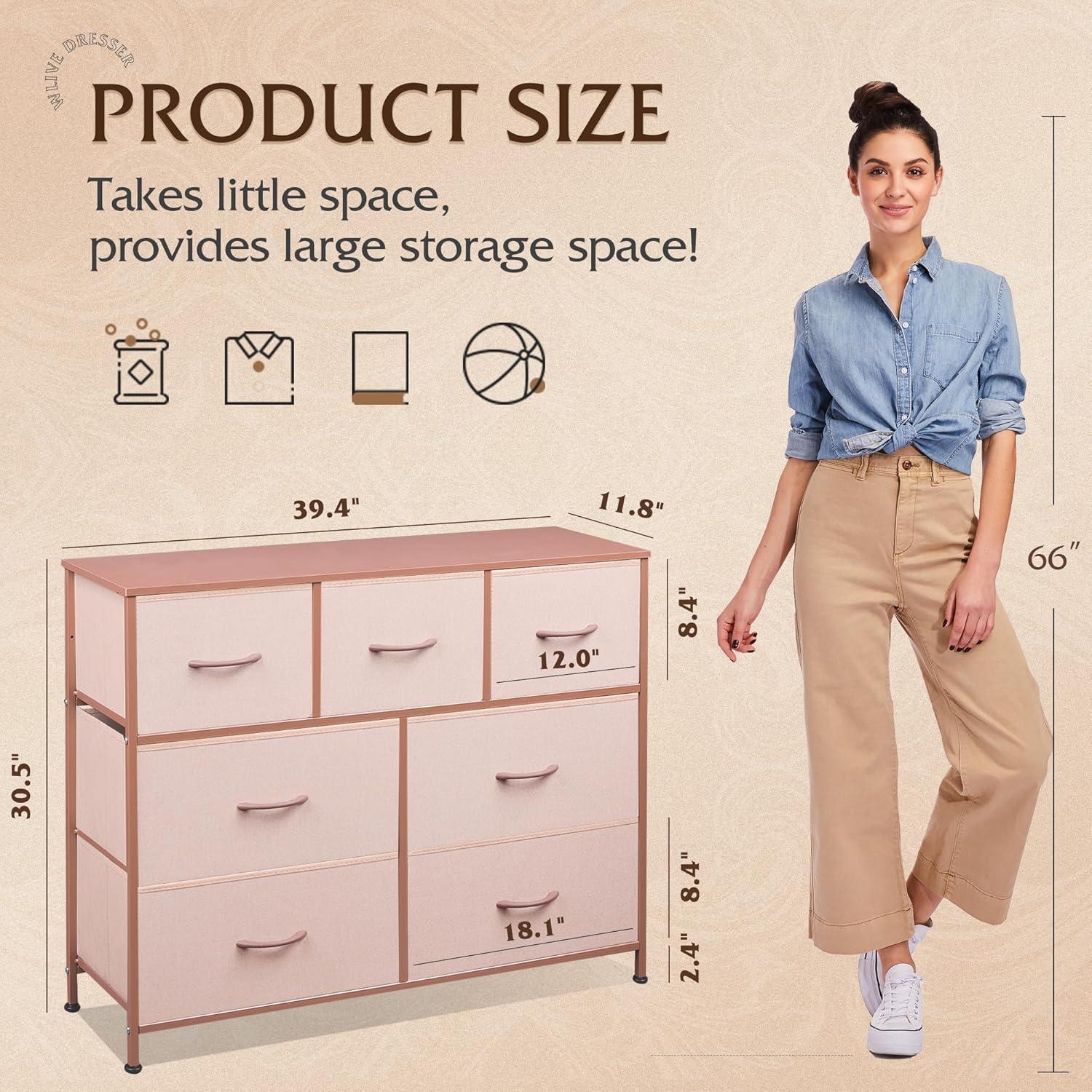 WLIVE 7 Drawer Dresser TV Stand, Dressers for Bedroom, Fabric Storage Tower, Hallway, Entryway, Closets, Sturdy Steel Frame, Wood Top, Easy Pull Handle, White(Pink)
