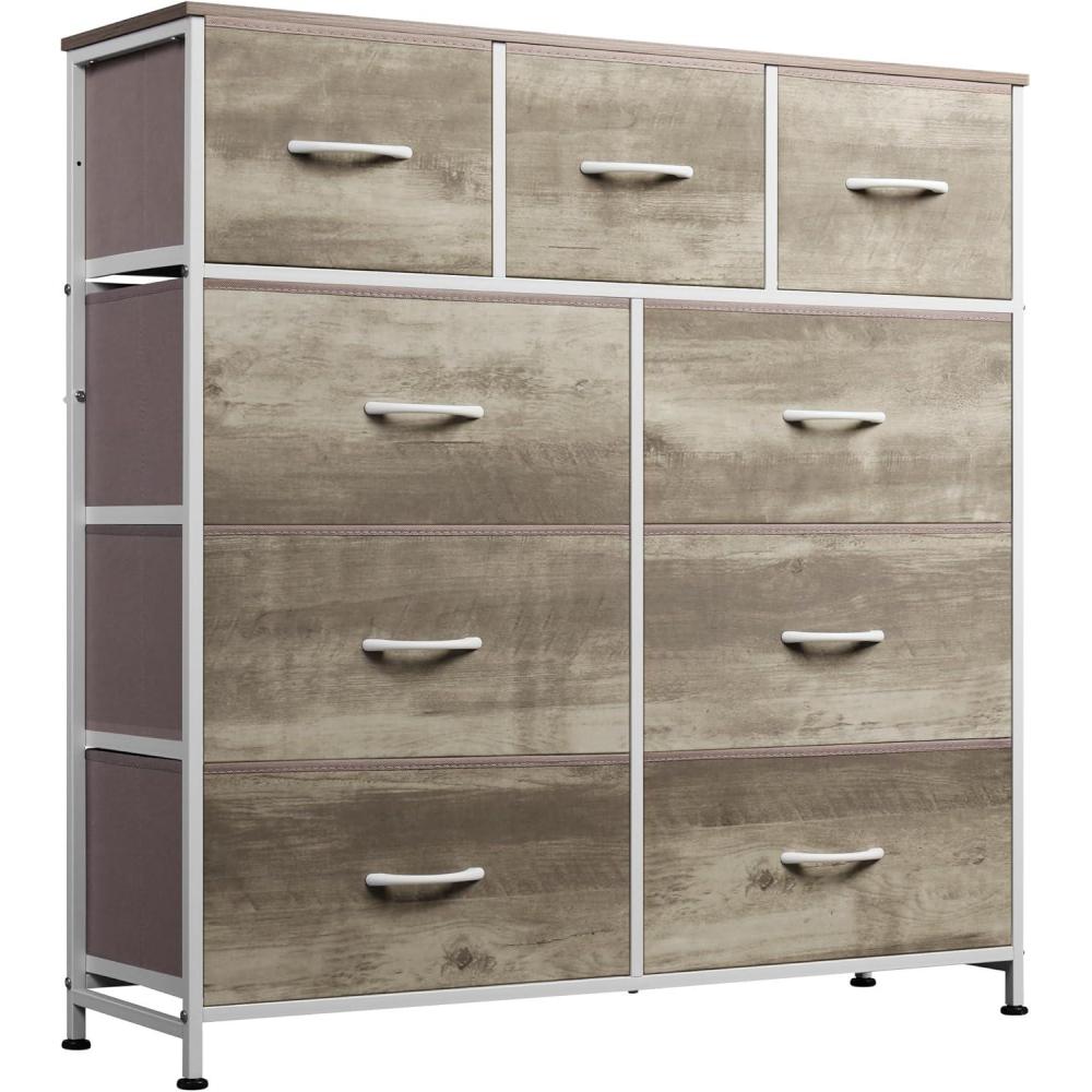 imageWLIVE 9Drawer Dresser Fabric Storage Tower for Bedroom Hallway Entryway Closet Tall Chest Organizer Unit with Fabric Bins Steel Frame Wood Top Easy Pull Handle Rustic Brown Wood Grain PrintGreige