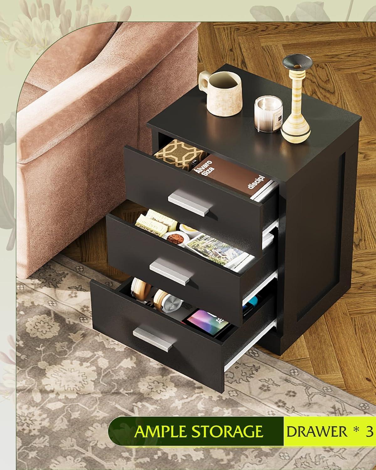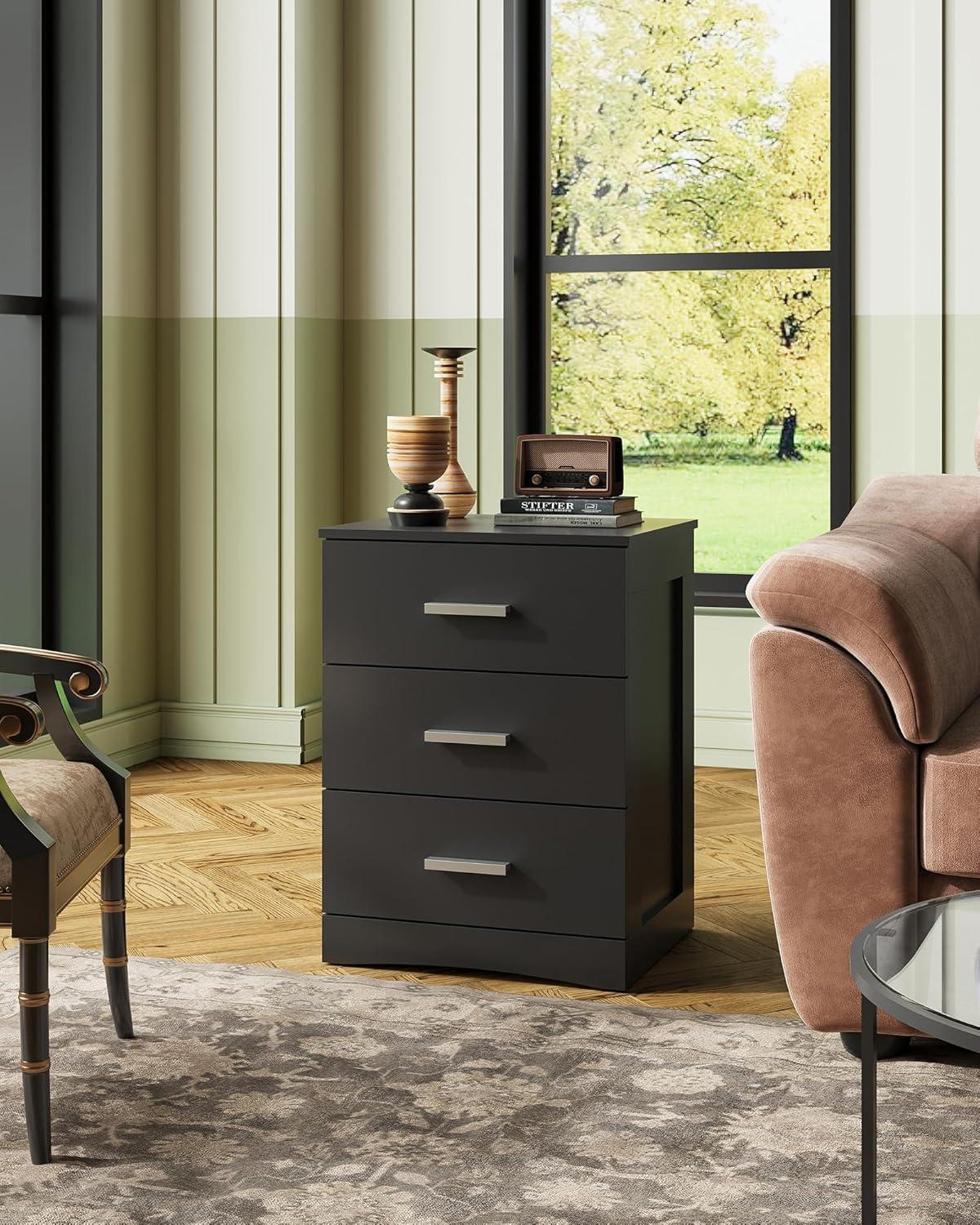 WLIVE Black Night Stand with 3 Drawers, Small Wooden Nightstand, Bed Side Table for Bedroom, Living Room, Dorm, Modern Minimalist Bedside Table, 12.9" D x 16" W x 21.6" H(Black)