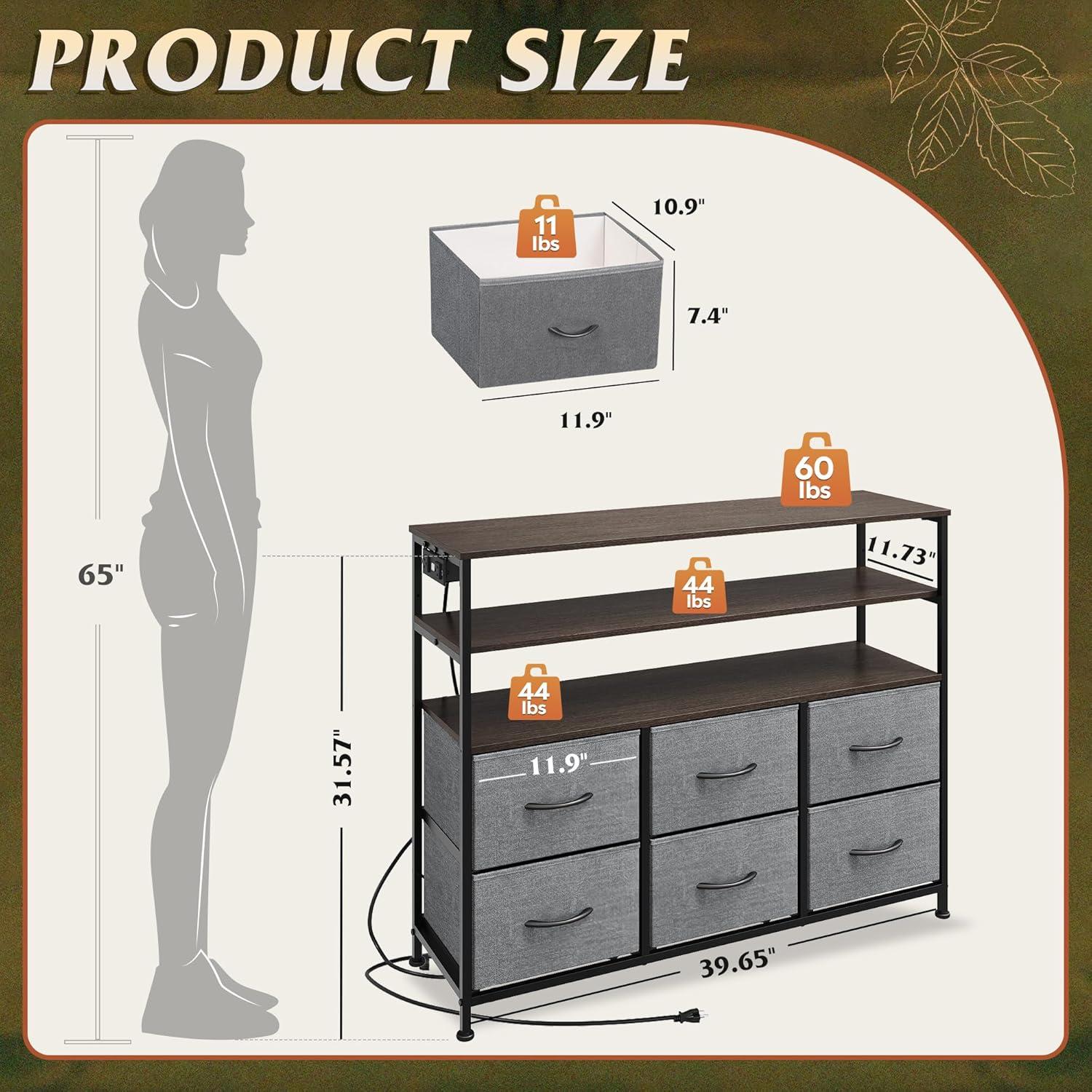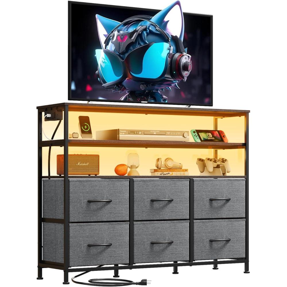WLIVE Black TV Stand for 40, 45 inch TV, Entertainment Center with LED Lights & Charging Station, TV Media Console Table with 6 Fabric Drawers and Open Shelves for Living Room, Hallway, Wood Top(Rustic Brown)