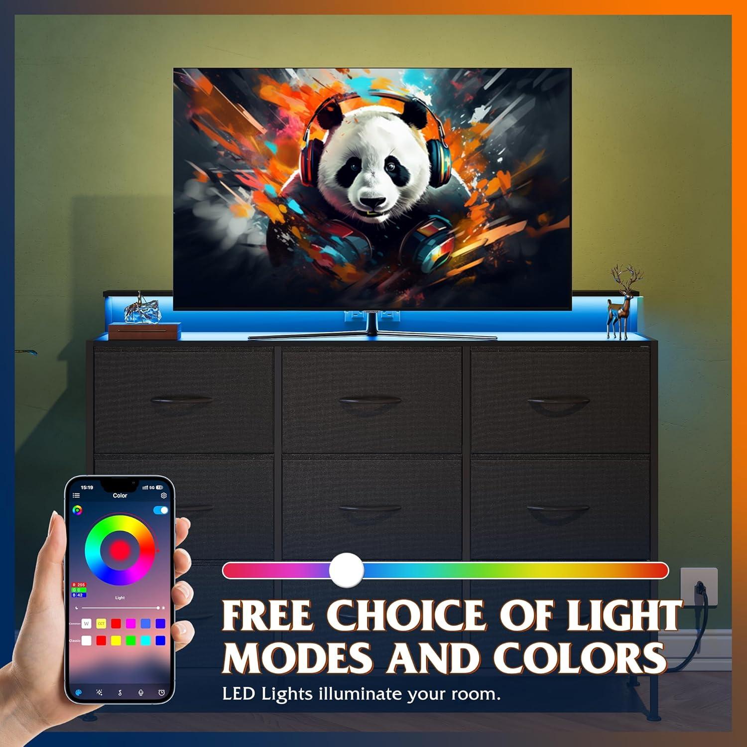 imageWLIVE Black TV Stand for 40 45 inch TV Entertainment Center with LED Lights ampamp Charging Station TV Media Console Table with 6 Fabric Drawers and Open Shelves for Living Room Hallway Wood TopWhite