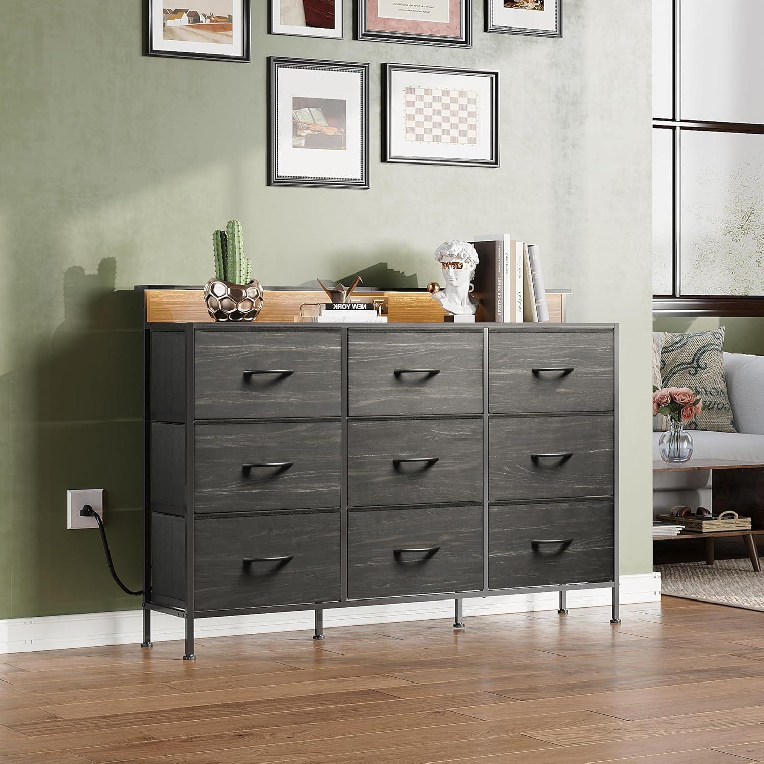 WLIVE Black TV Stand for 45, 50, 55 inch TV, Entertainment Center with LED Lights & Charging Station, TV Media Console Table with 9 Fabric Drawers and Open Shelves for Living Room, Hallway, Wood Top(Charcoal Black Wood Grain)