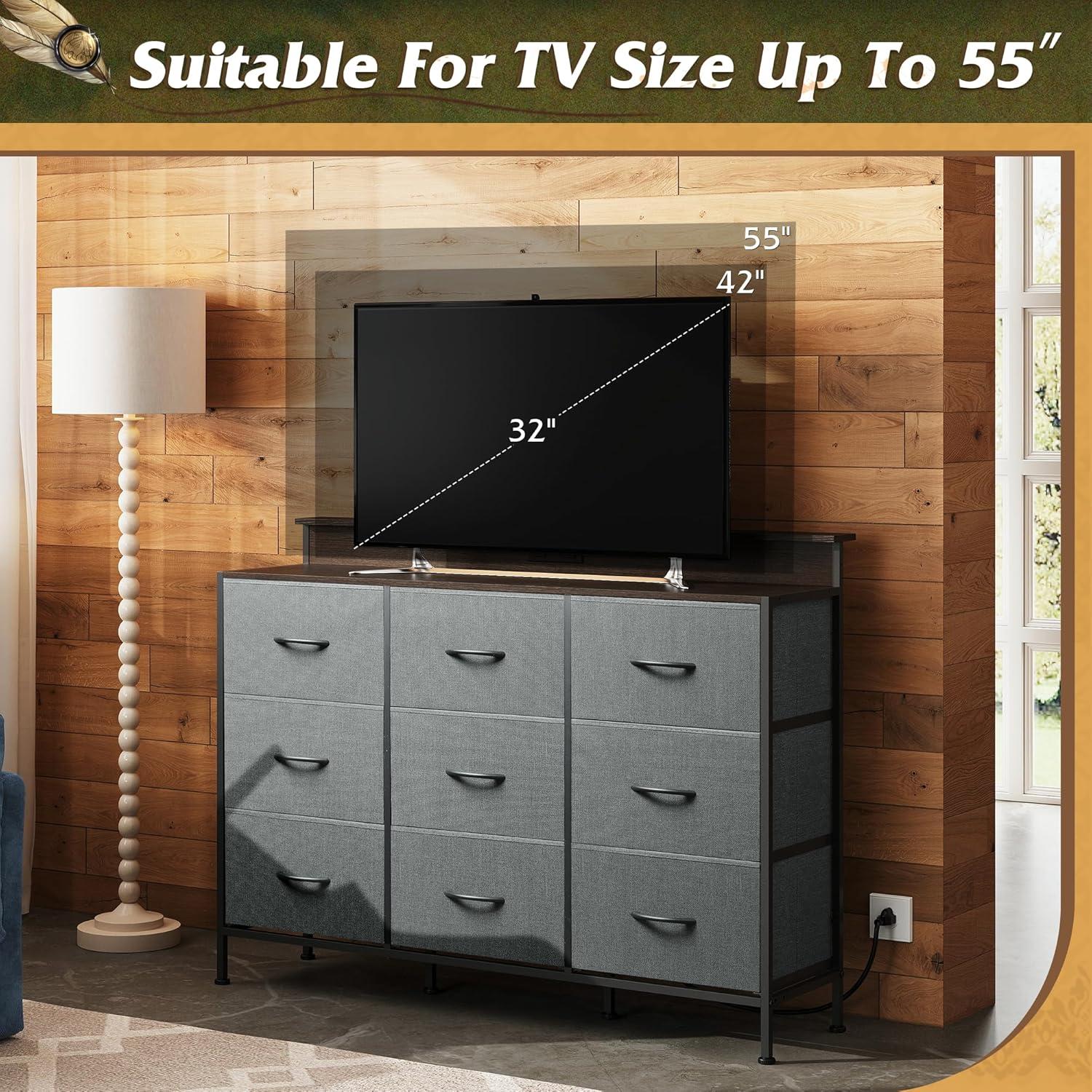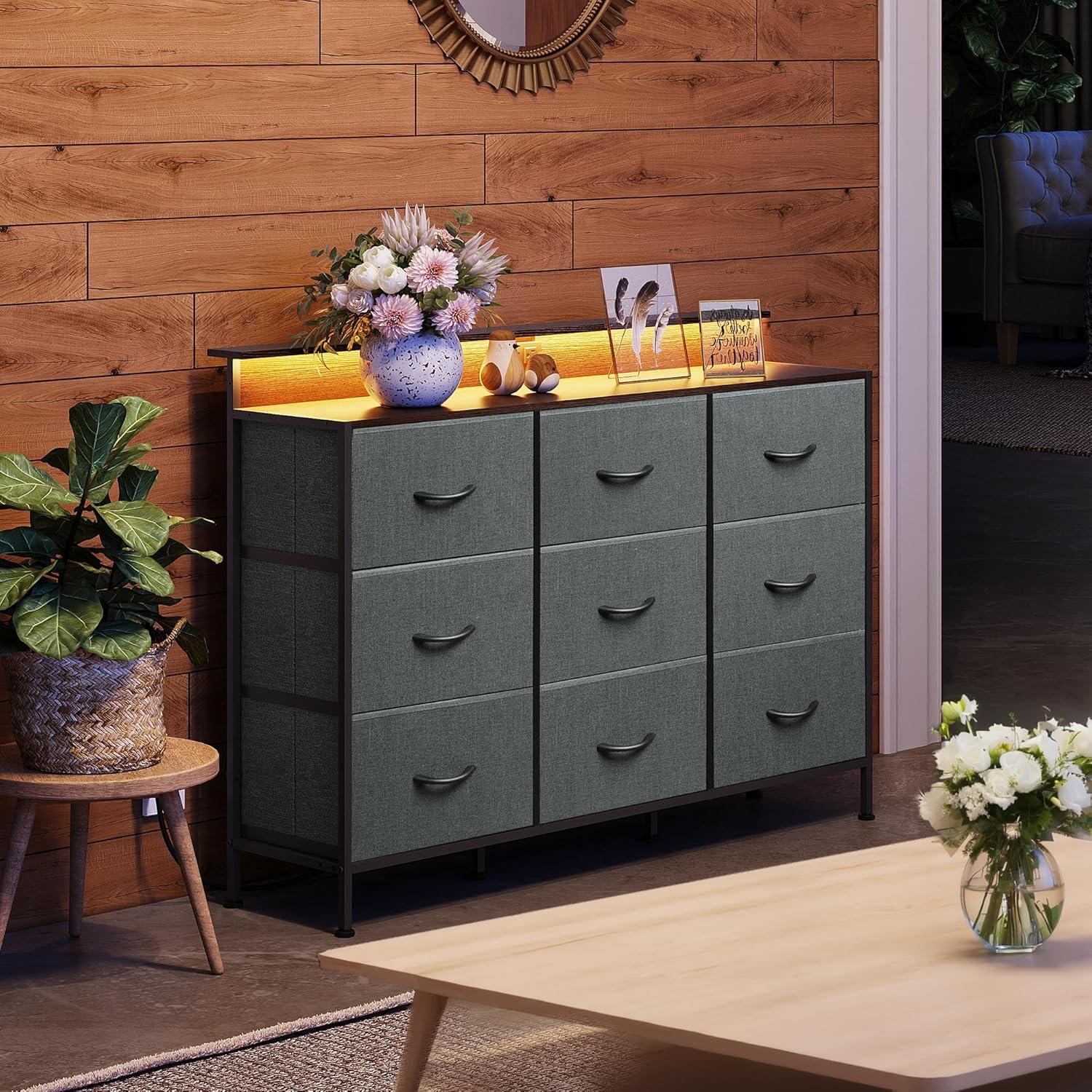 WLIVE Black TV Stand for 45, 50, 55 inch TV, Entertainment Center with LED Lights & Charging Station, TV Media Console Table with 9 Fabric Drawers and Open Shelves for Living Room, Hallway, Wood Top(Dark Grey)