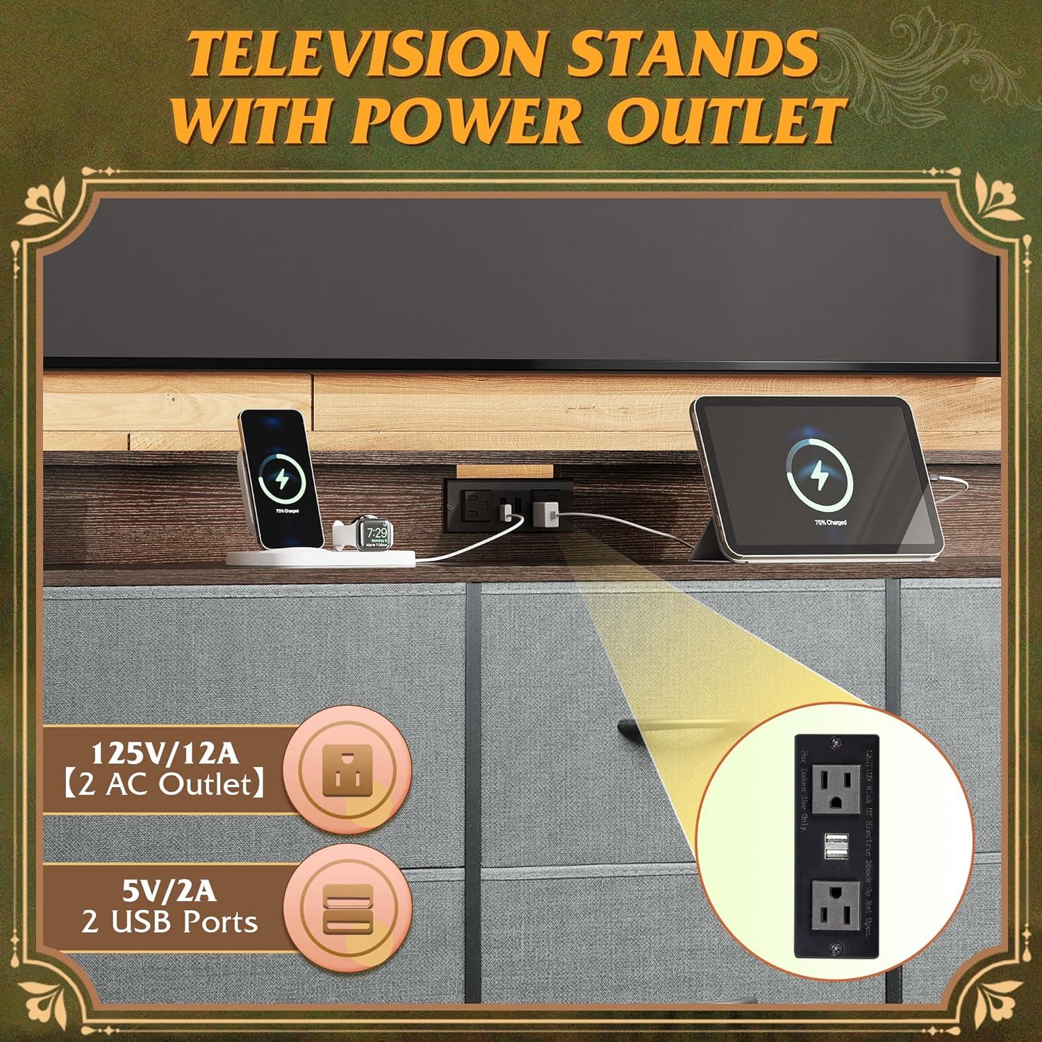 WLIVE Black TV Stand for 45, 50, 55 inch TV, Entertainment Center with LED Lights & Charging Station, TV Media Console Table with 9 Fabric Drawers and Open Shelves for Living Room, Hallway, Wood Top(Rustic Brown)