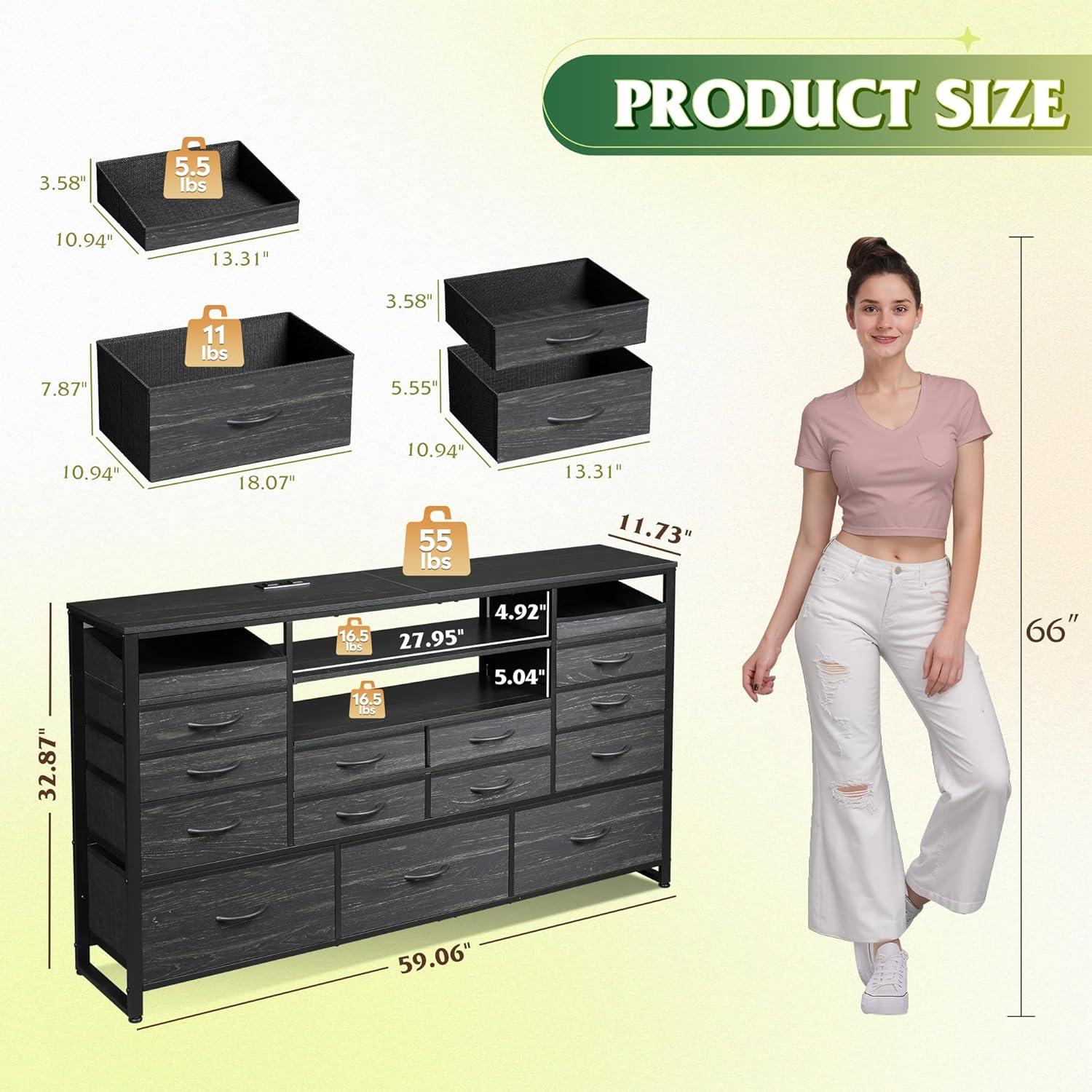 WLIVE Black TV Stand for 55, 60, 65 inch TV, Entertainment Center with LED Lights & Charging Station, TV Media Console Table with 15 Fabric Drawers and Open Shelves for Living Room, Hallway, Wood Top(Charcoal Black Wood Grain Print)