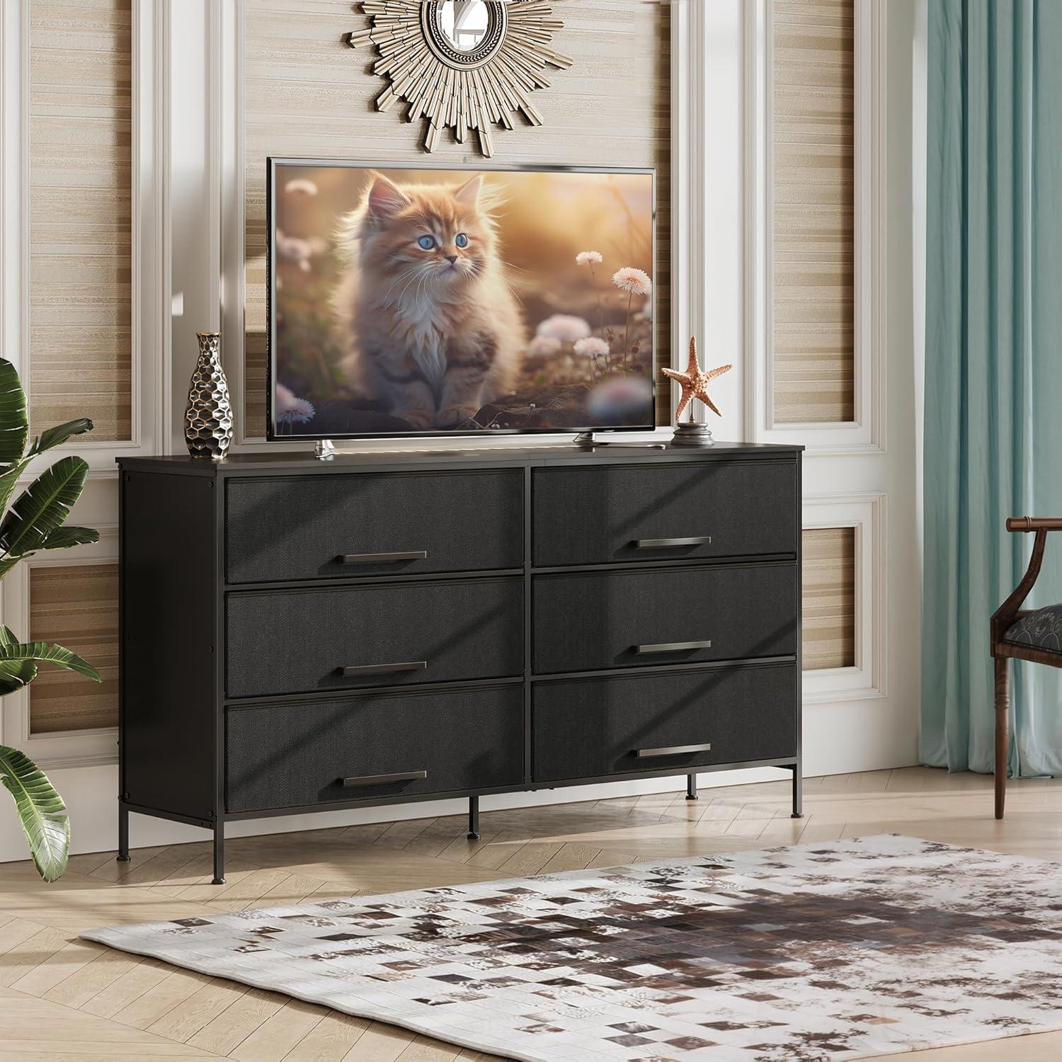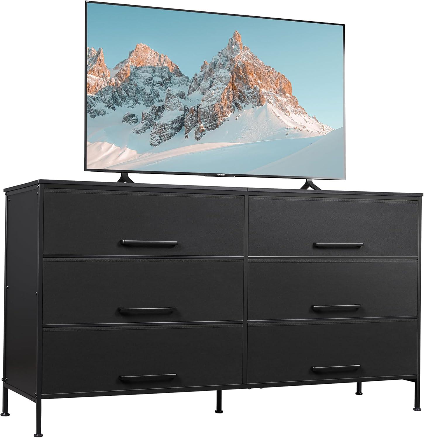 WLIVE Black TV Stand for 60, 65, 70 inch TV, Large Entertainment Center with 6 Fabric Drawer, TV Media Console Table with Wood Top, Adjustable Feet for Living Room, Hallway(Black)