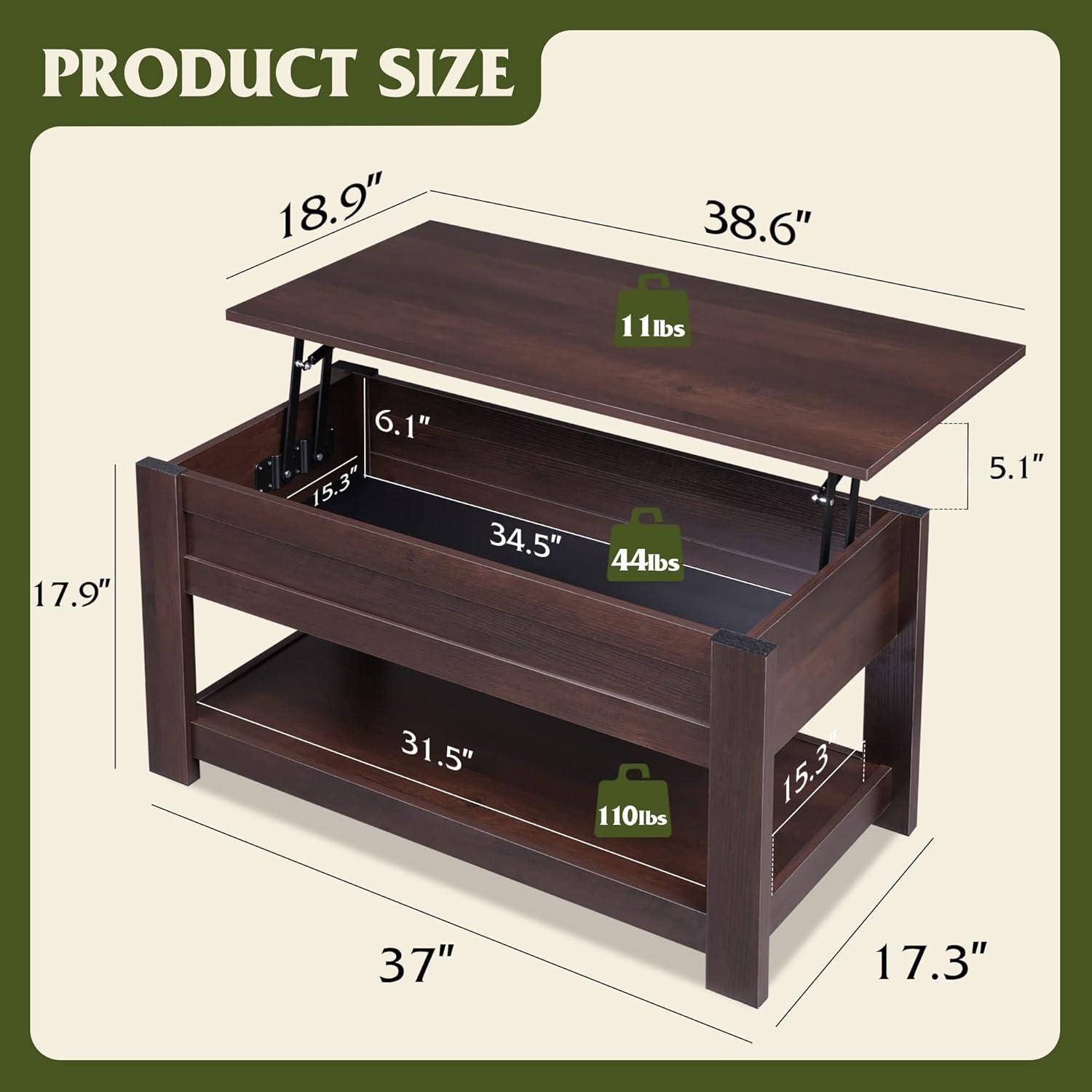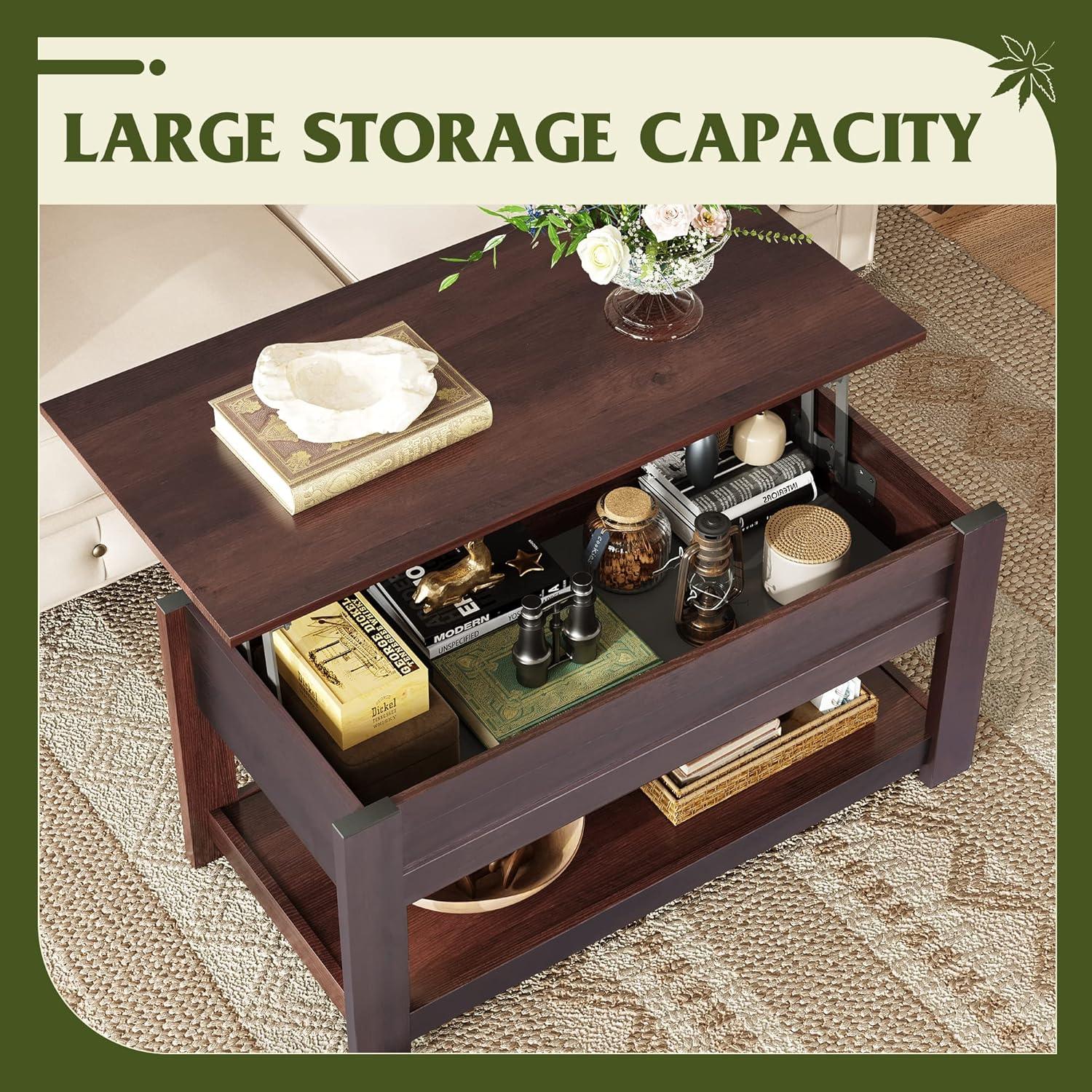 WLIVE Coffee Table, 39" Lift Top Coffee Table with Hidden Compartment and Storage Shelf for Living Room, Reception Room and Bedroom, Red-Brown