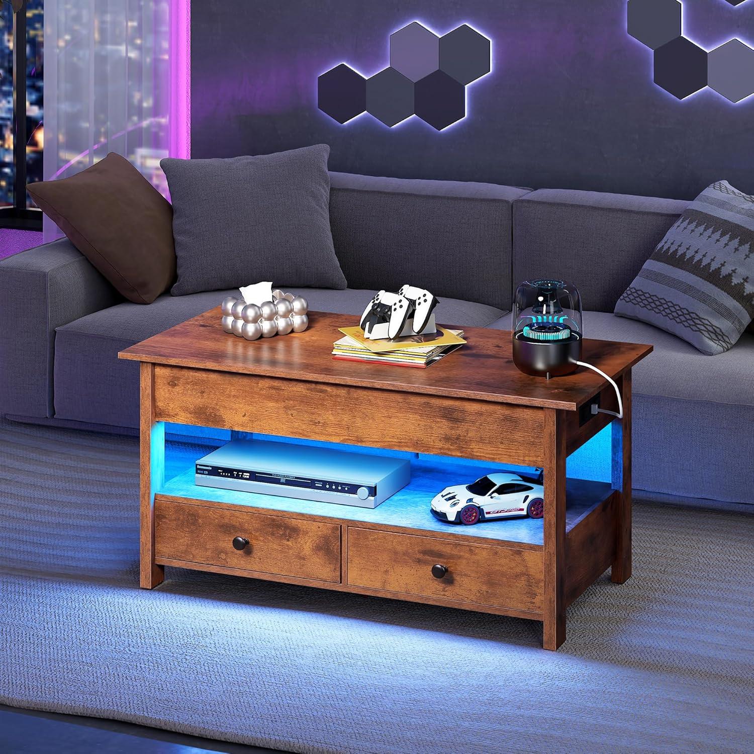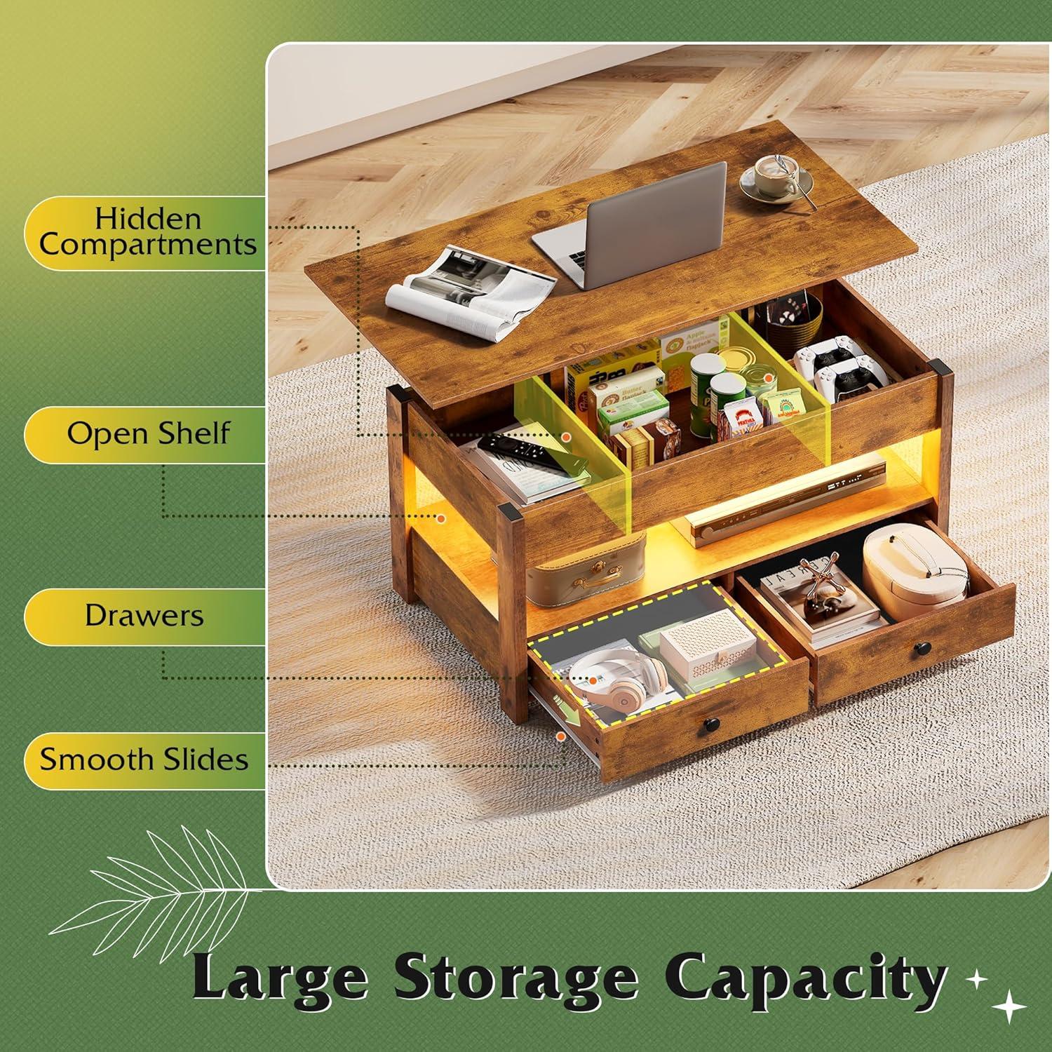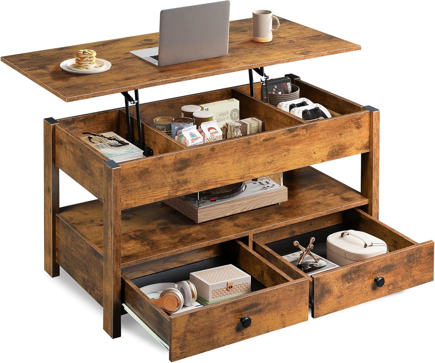 WLIVE Coffee Table, Lift Top Coffee Table with 2 Drawers, Large Hidden Hidden Compartment and Open Shelf, Lift Tabletop, Dining Table for Living Room, Black(Rustic Brown)