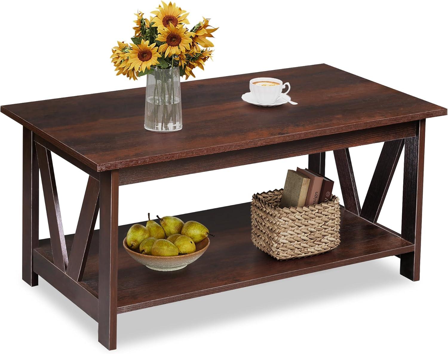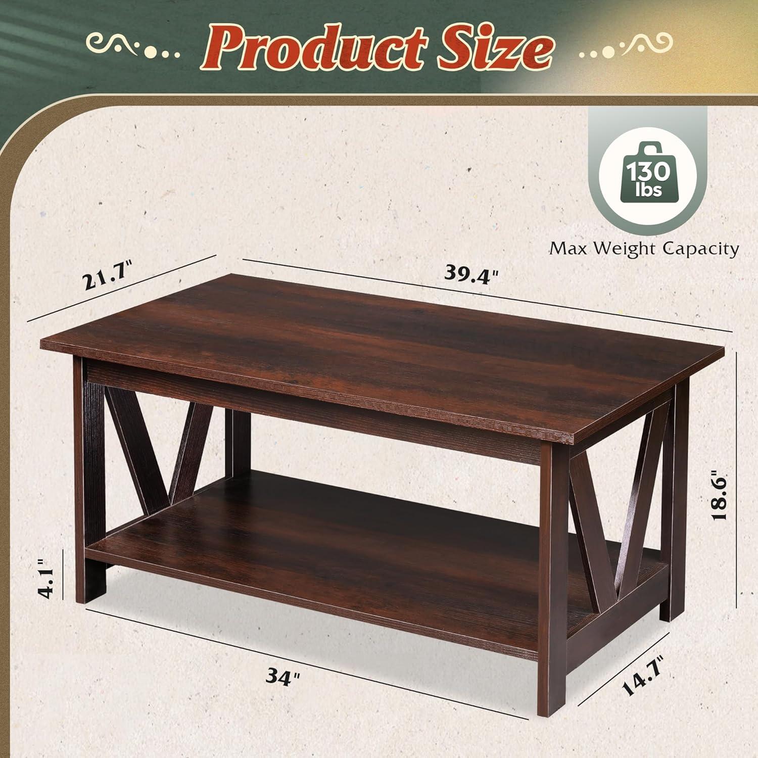 【Large 2-Tier Storage for Daily Essentials】Keep your space organized with the spacious dual-layer open shelf—perfect for books, decor, baskets and snacks—while the wide coffee table top provides plenty of room for coffee, games, or gatherings.