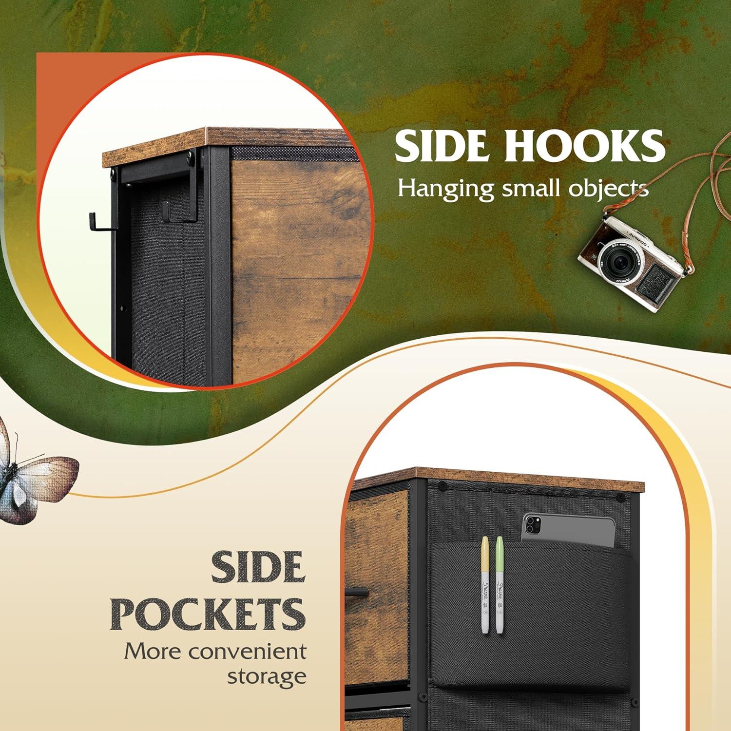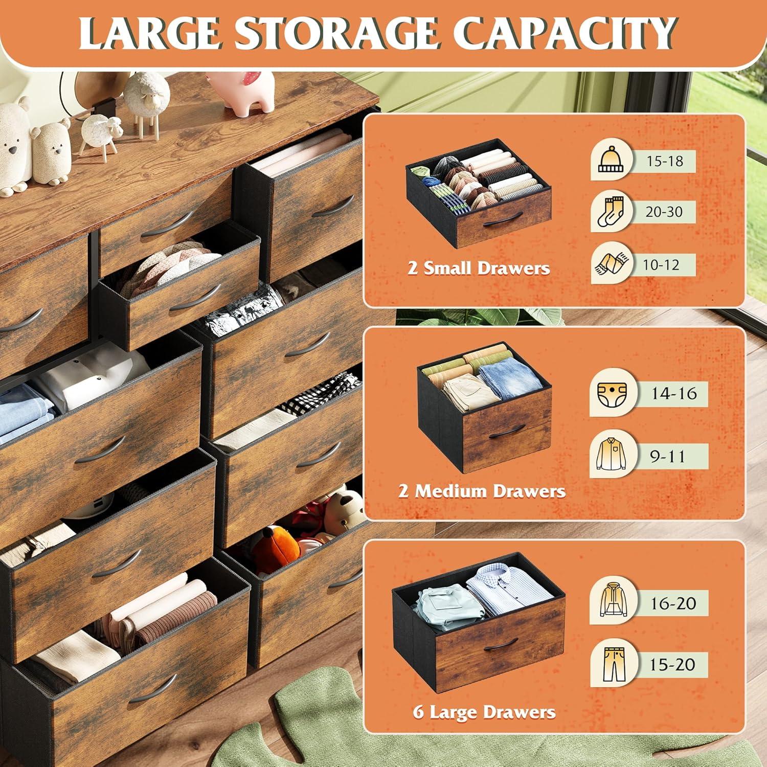 WLIVE Dresser for Bedroom with 10 Drawers, Fabric Dresser Chest of Drawers with Side Pockets and Hooks, Sturdy Metal Frame, Drawers Organizer Unit for Living Room, Hallway, Black(Rustic Brown Wood Grain Print)