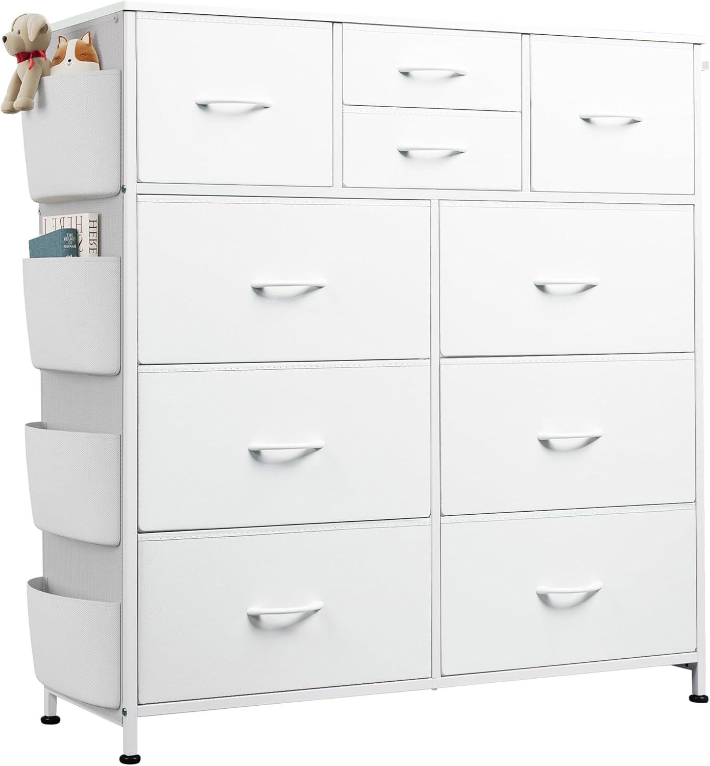 WLIVE Dresser for Bedroom with 10 Drawers, Fabric Dresser Chest of Drawers with Side Pockets and Hooks, Sturdy Metal Frame, Drawers Organizer Unit for Living Room, Hallway, Black(White)