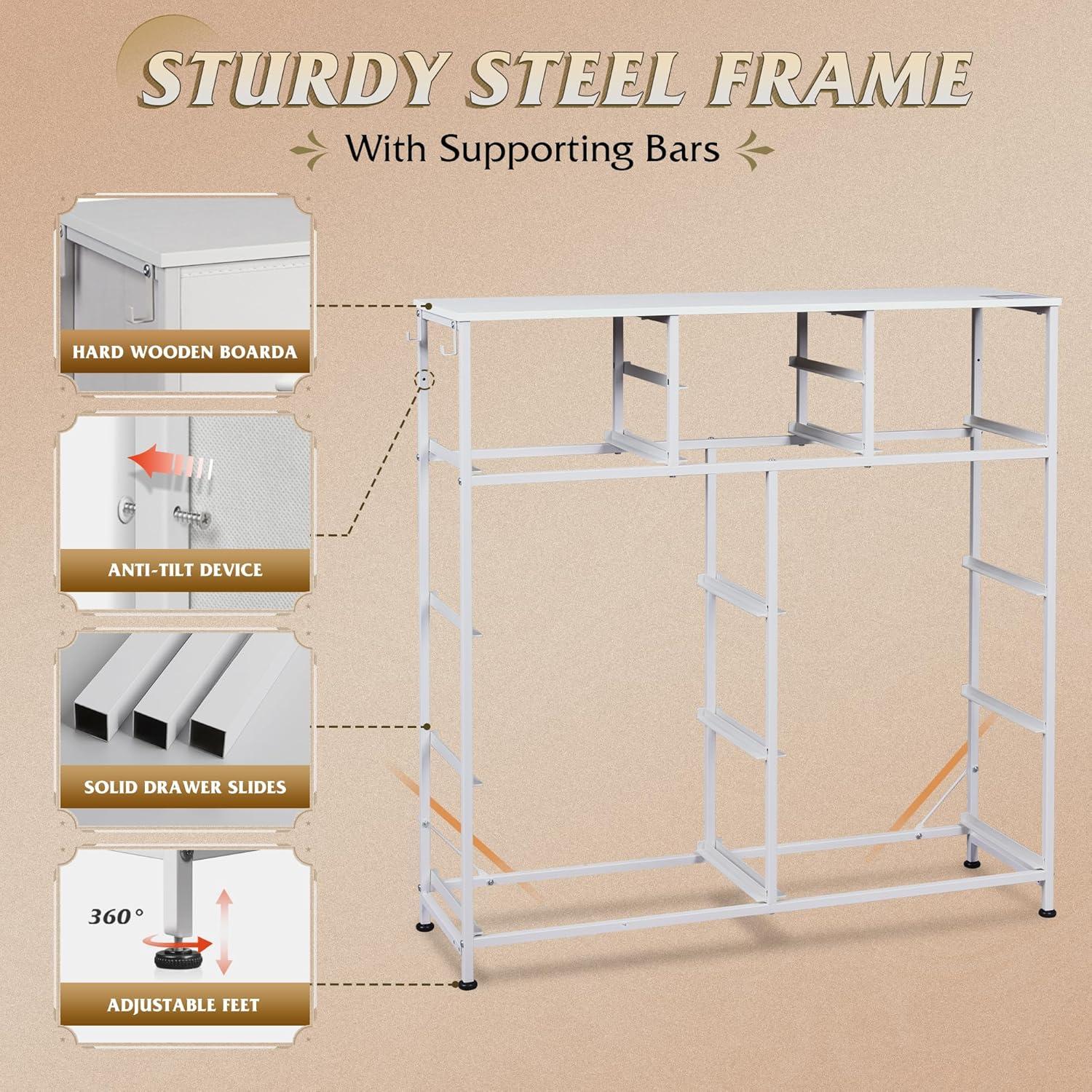 ✅【Stylish and Versatile】 The furniture is made of sturdy steel frame support, MDF wooden waterproof countertop, and premium non-woven fabric. The back is reinforced with tension bars to enhance overall stability, making the drawer very easy to slide in and out and align correctly. Ensure safe and worry free use. The wooden top can bear up to 70 pounds, providing a sturdy surface for items such as televisions or display vases, lights, and books.