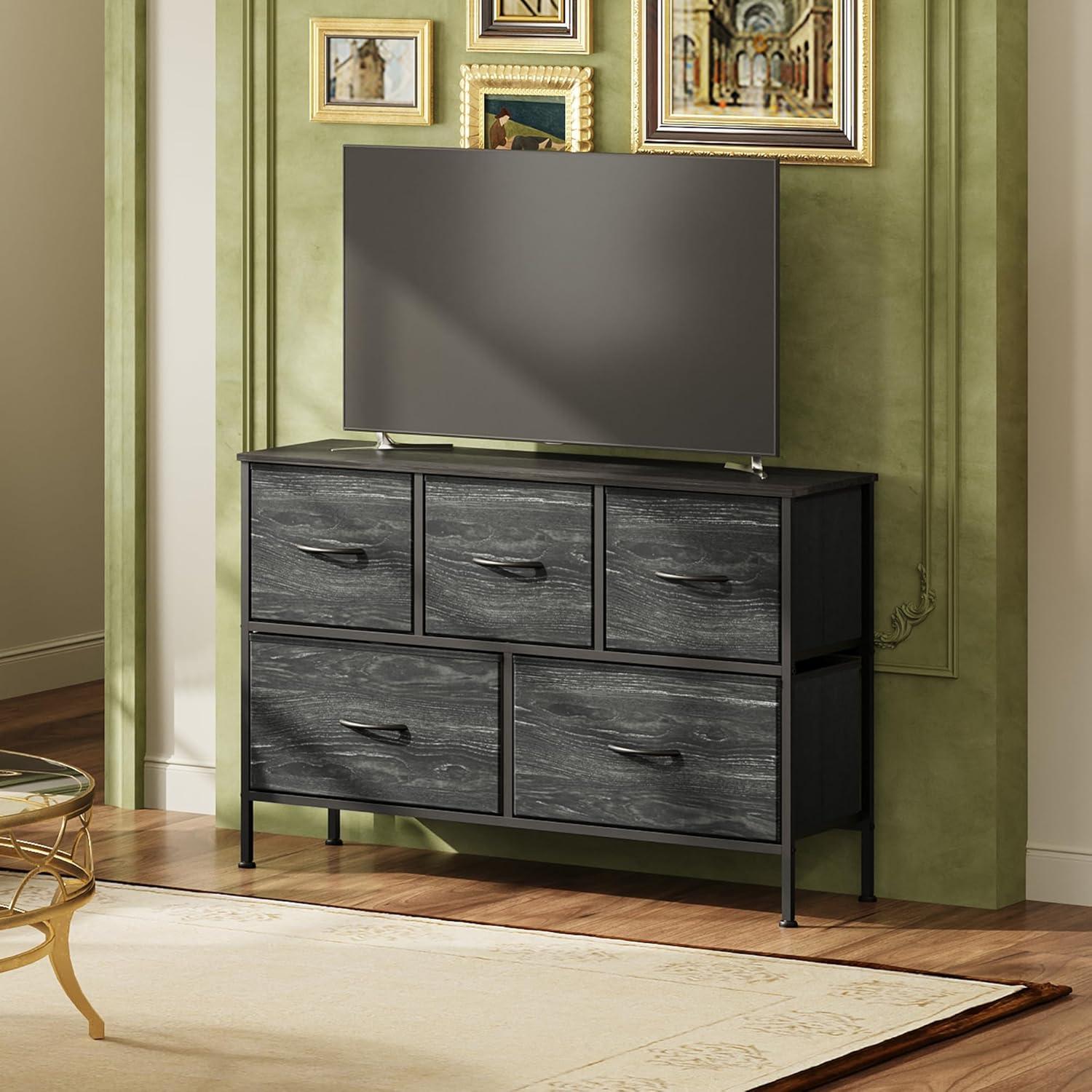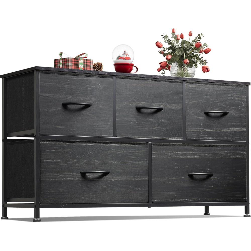 WLIVE Dresser for Bedroom with 5 Drawers, Wide Chest of Drawers, Fabric Dresser, Storage Organizer Unit with Fabric Bins for Closet, Living Room, Hallway, Black and Rustic Brown(Charcoal Black Wood Grain Print)