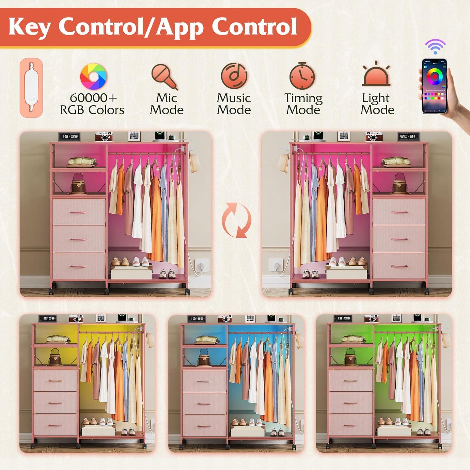 imageWLIVE Dresser for Bedroom with Clothes Rack 3 Drawer Dresser with LED Lights ampamp Charging Station Fabric Dressers ampamp Chest of Drawers Storage Organizer with Open Shelves for Closet Living Room PinkBlack