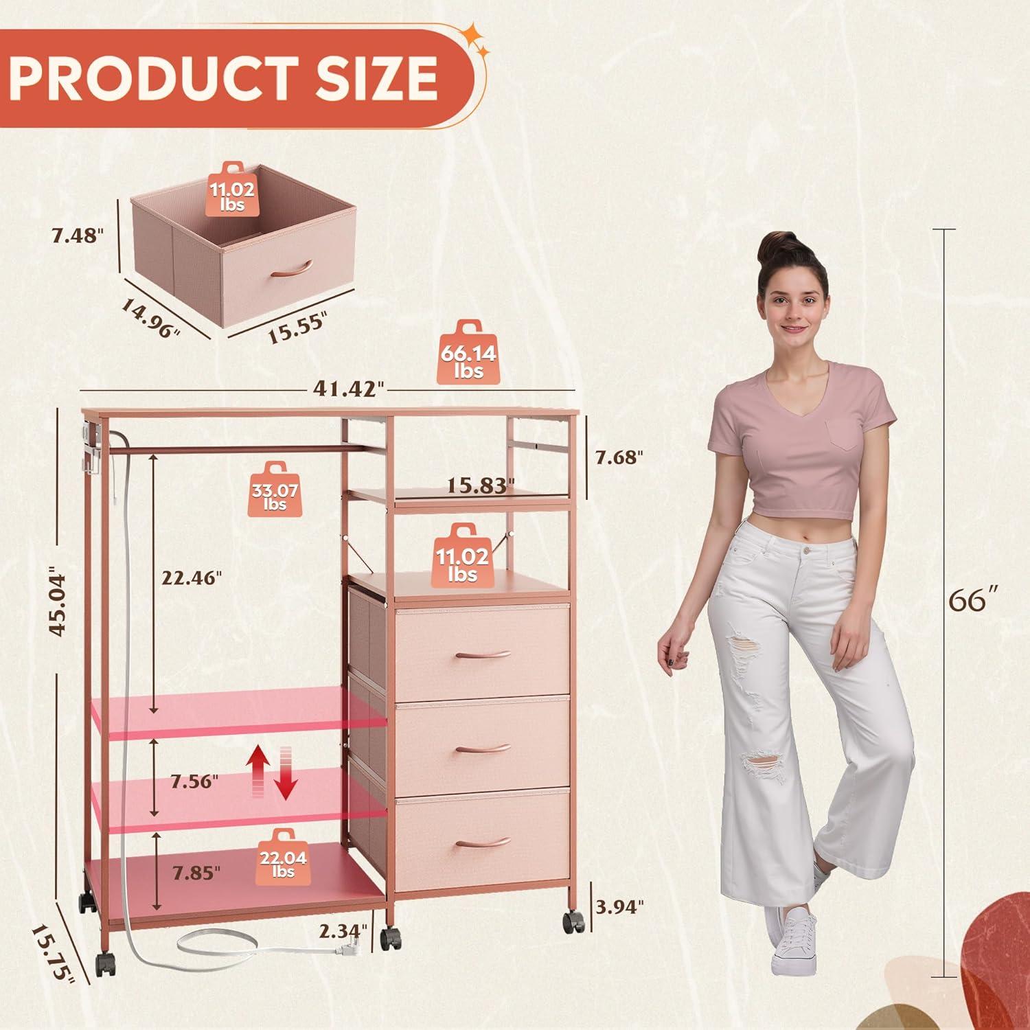 imageWLIVE Dresser for Bedroom with Clothes Rack 3 Drawer Dresser with LED Lights ampamp Charging Station Fabric Dressers ampamp Chest of Drawers Storage Organizer with Open Shelves for Closet Living Room PinkPink