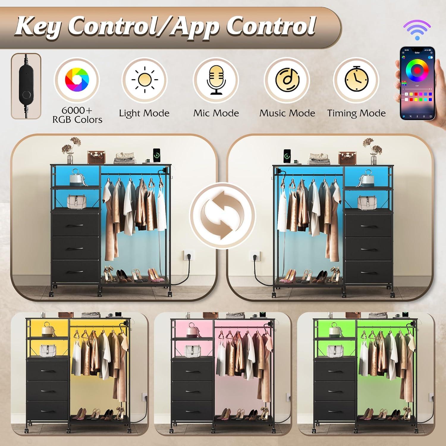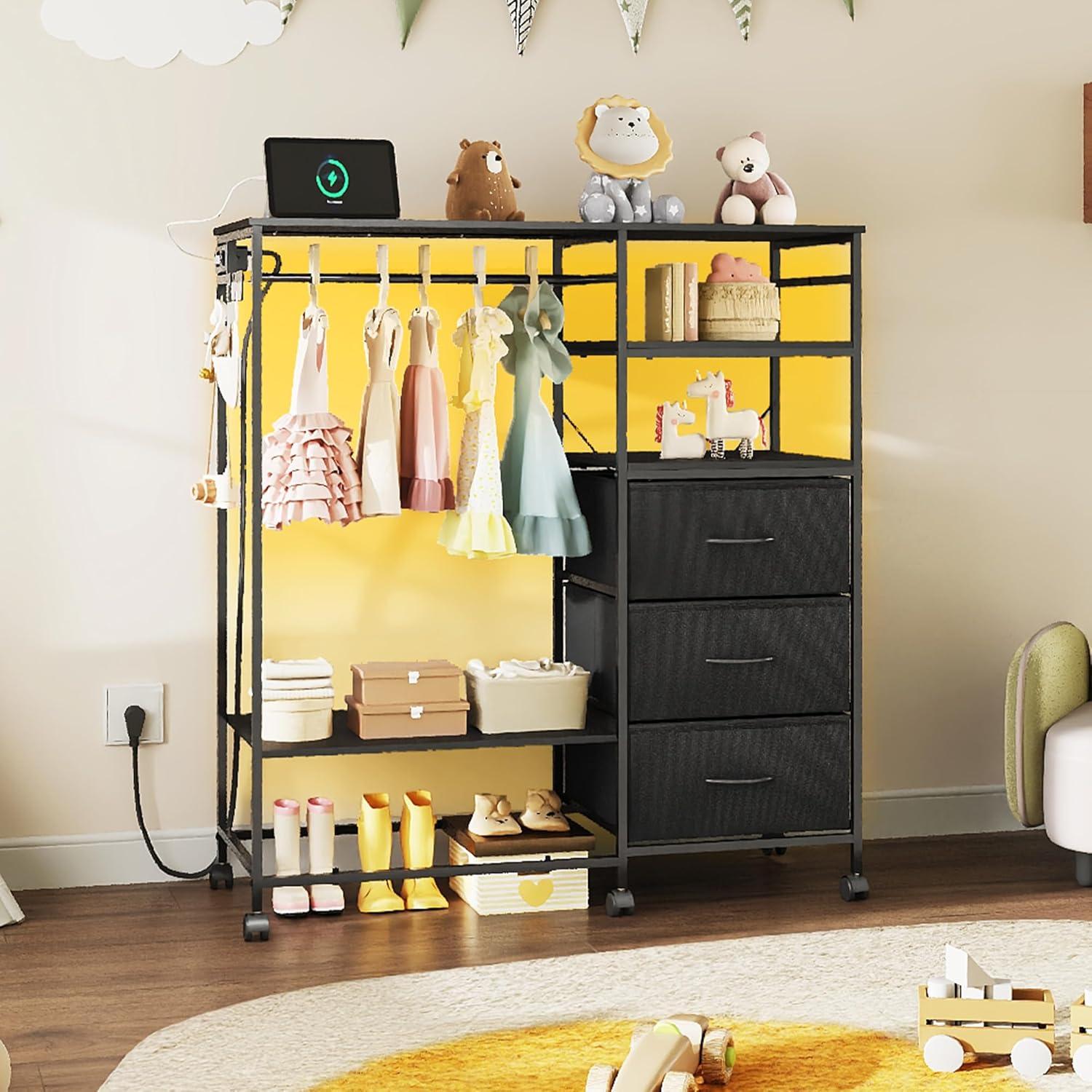 WLIVE Dresser for Bedroom with Clothes Rack, 3 Drawer Dresser with LED Lights & Charging Station, Fabric Dressers & Chest of Drawers, Storage Organizer with Open Shelves for Closet, Living Room, Pink