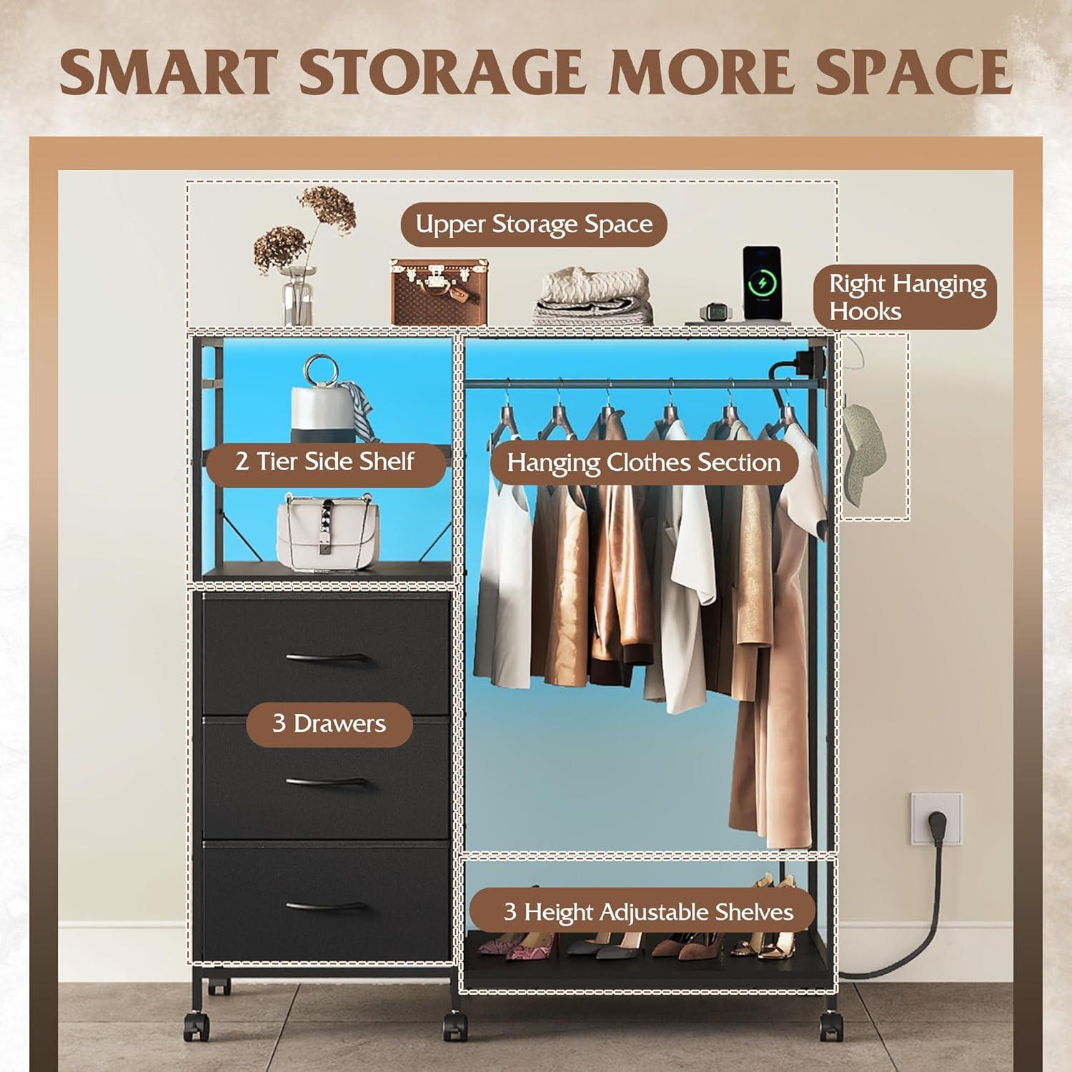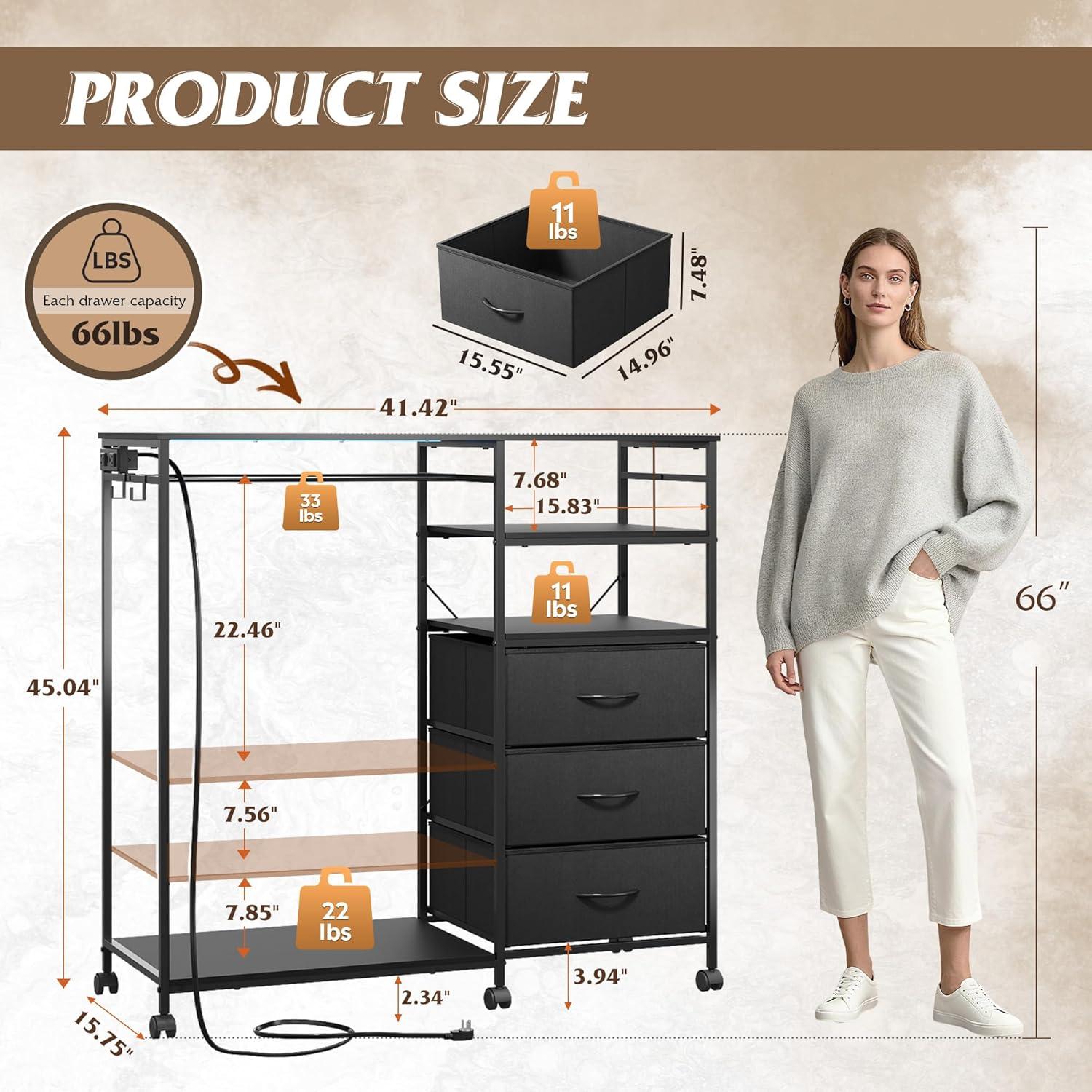ăđ 5-in-1Multifunctional Clothes RackăSpacious wooden desktop + 3 large drawers + 1 long dresser/coat hanging rod + 3 storage open shelves + side hooks. The 3 large drawers accommodate bulky clothing. The valet rack has a bearing capacity of 33lbs and supports left/right reversible installationâyou may choose to install it on the left or right side according to your habits. The side hooks can be used for hanging bags. The base storage shelf offers 3-position height adjustment, flexibly housing garments, storage bins, and footwear.
