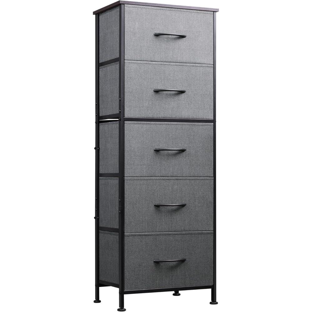WLIVE Fabric Dresser, 5-Drawer Tall Dresser for Bedroom, Storage Organizer with Fabric Bins, Wood Top, Sturdy Steel Frame, Chest of Drawers for Closet, Hallway, Rustic Brown Wood Grain Print(A-dark Grey)