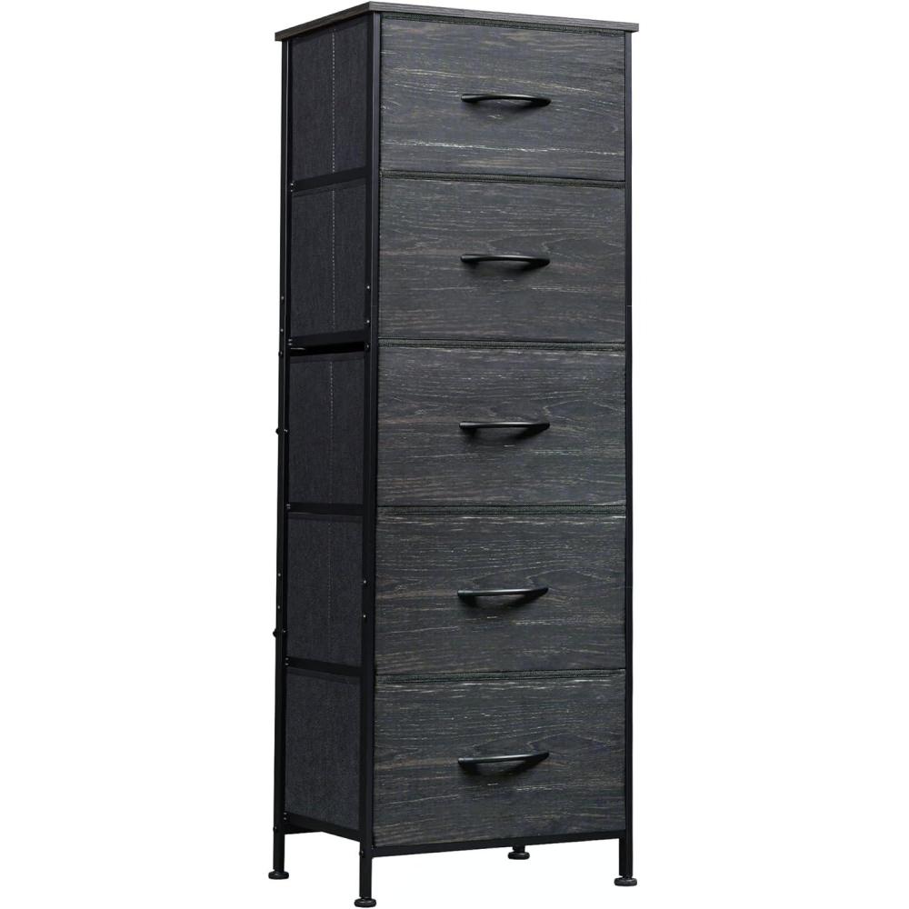 imageWLIVE Fabric Dresser 5Drawer Tall Dresser for Bedroom Storage Organizer with Fabric Bins Wood Top Sturdy Steel Frame Chest of Drawers for Closet Hallway Rustic Brown Wood Grain PrintCharcoal Black
