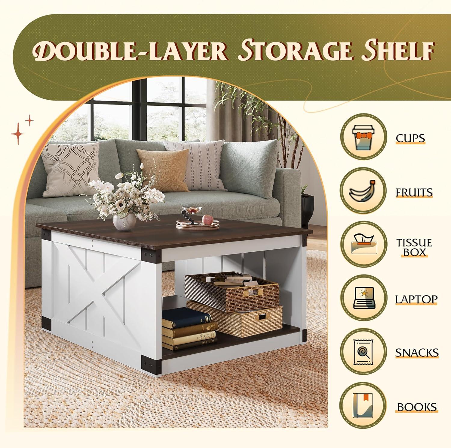 Large Storage Space: This large square coffee table measures 31.5″W x 31.5″D x17.4″H. Make your living room more big and tidy with our farmhouse coffee table. Both side tabletops can be fliped up to reveal spacious compartments, ideal for storing pillows, blankets, board games, and baby toys while keeping them away from dust and maintaining the room clean and tidy.
