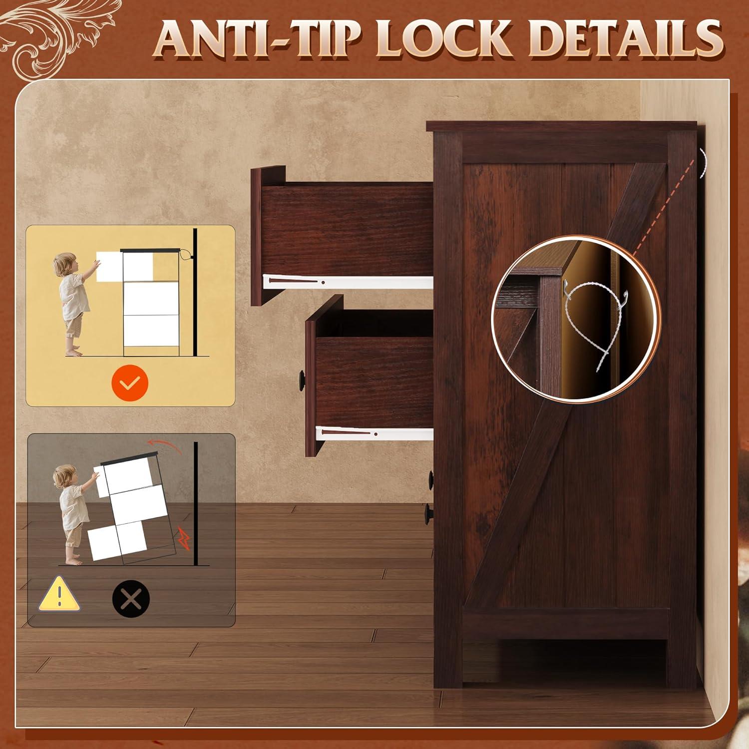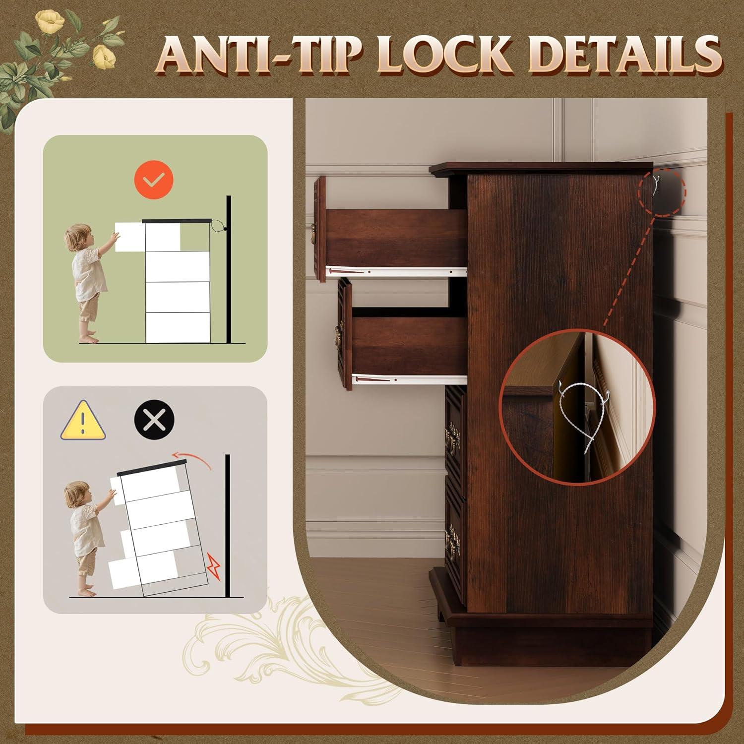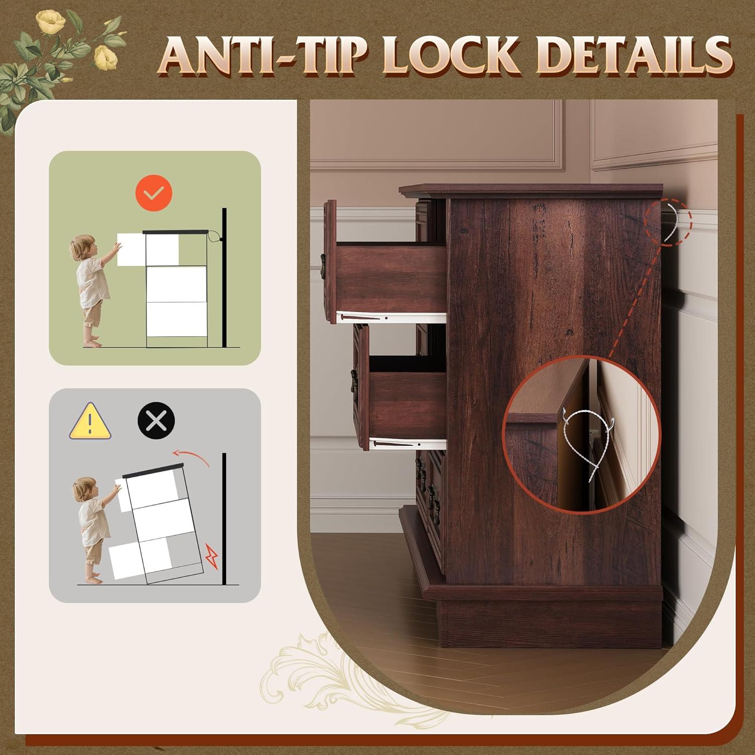 SAFE AND STURDY: The dressers & chests of drawers are made of durable engineered wood, featuring a thick tabletop that can support heavy items. The arched table legs design enhances the stability and durability of the storage cabinet. An anti-tipping device ensures the safety of your family members by preventing wobbling and tipping.