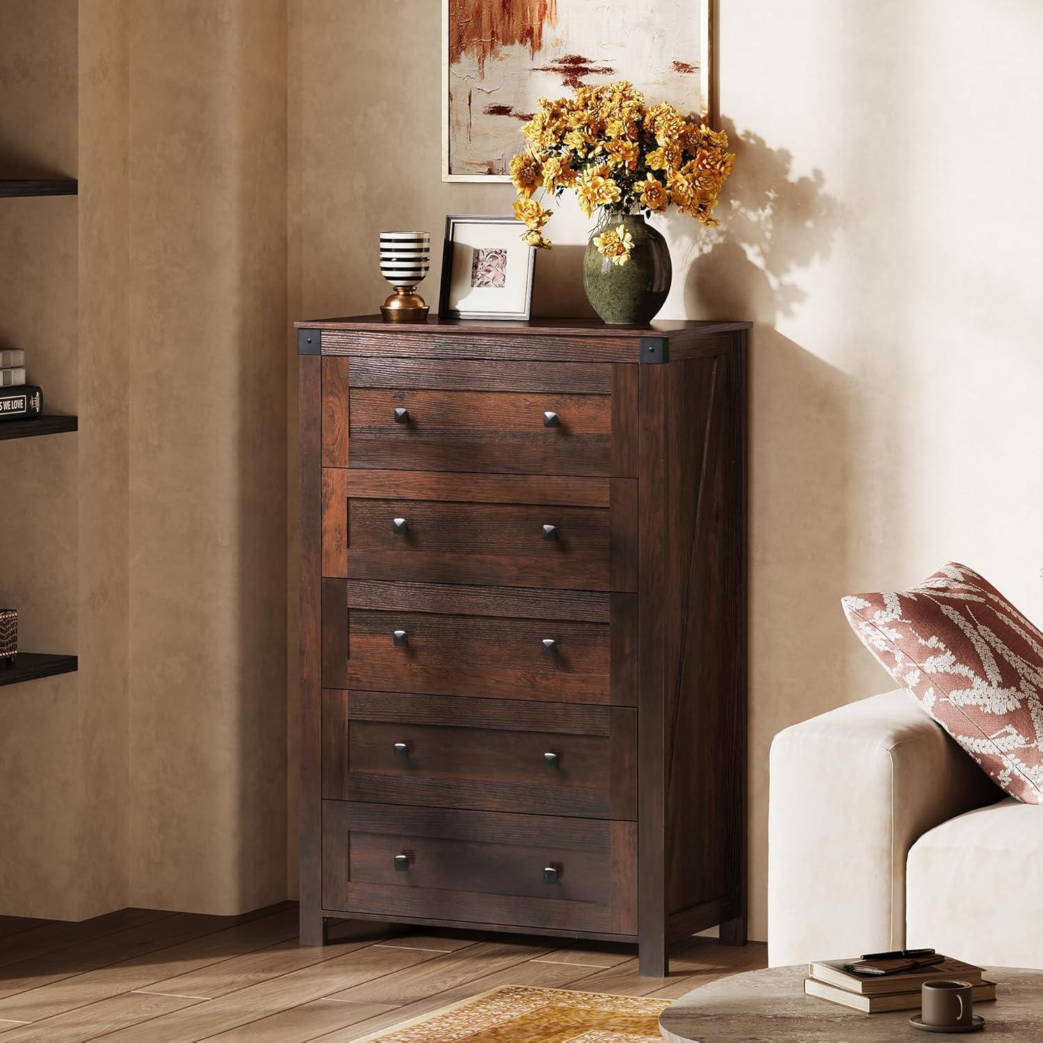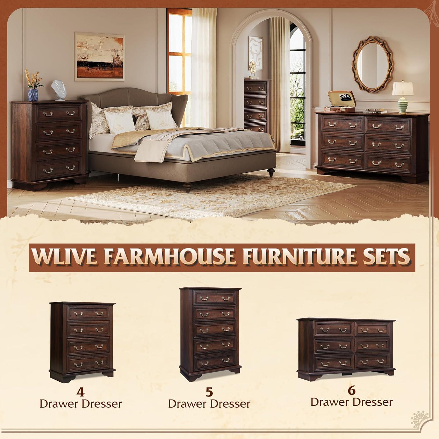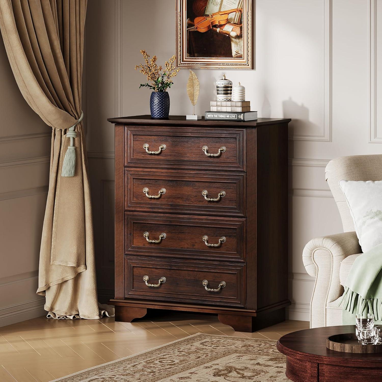 WLIVE Farmhouse Dresser for Bedroom, Black Wood Storge Cabinet with 4 Drawers for Living Room, Hallway, Closet, Tall Retro Nightstand with Roman Metal Handle(Brown)
