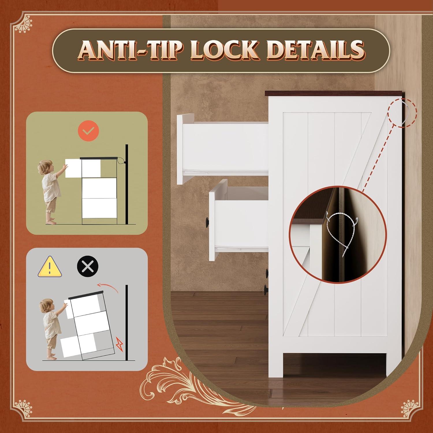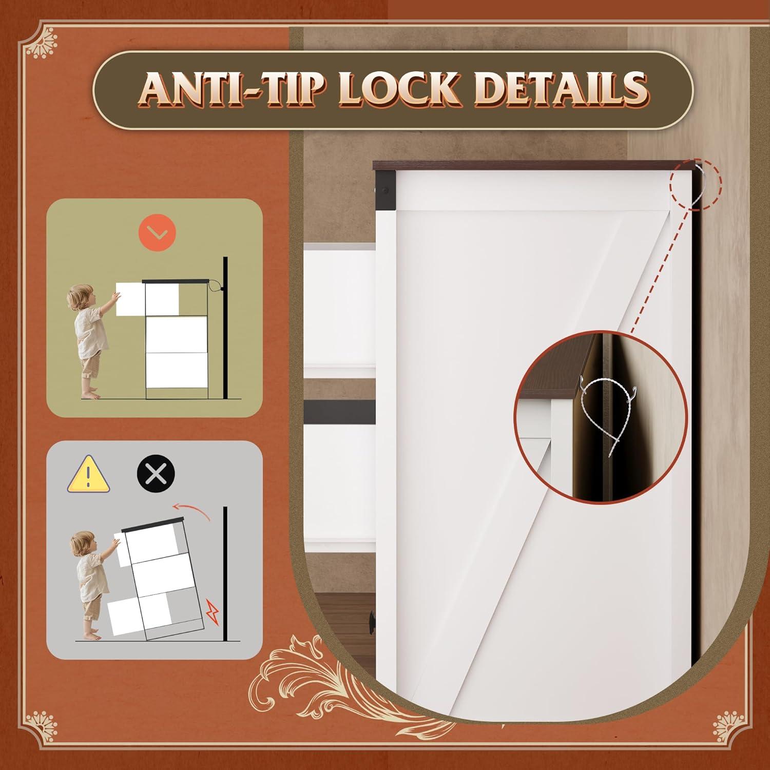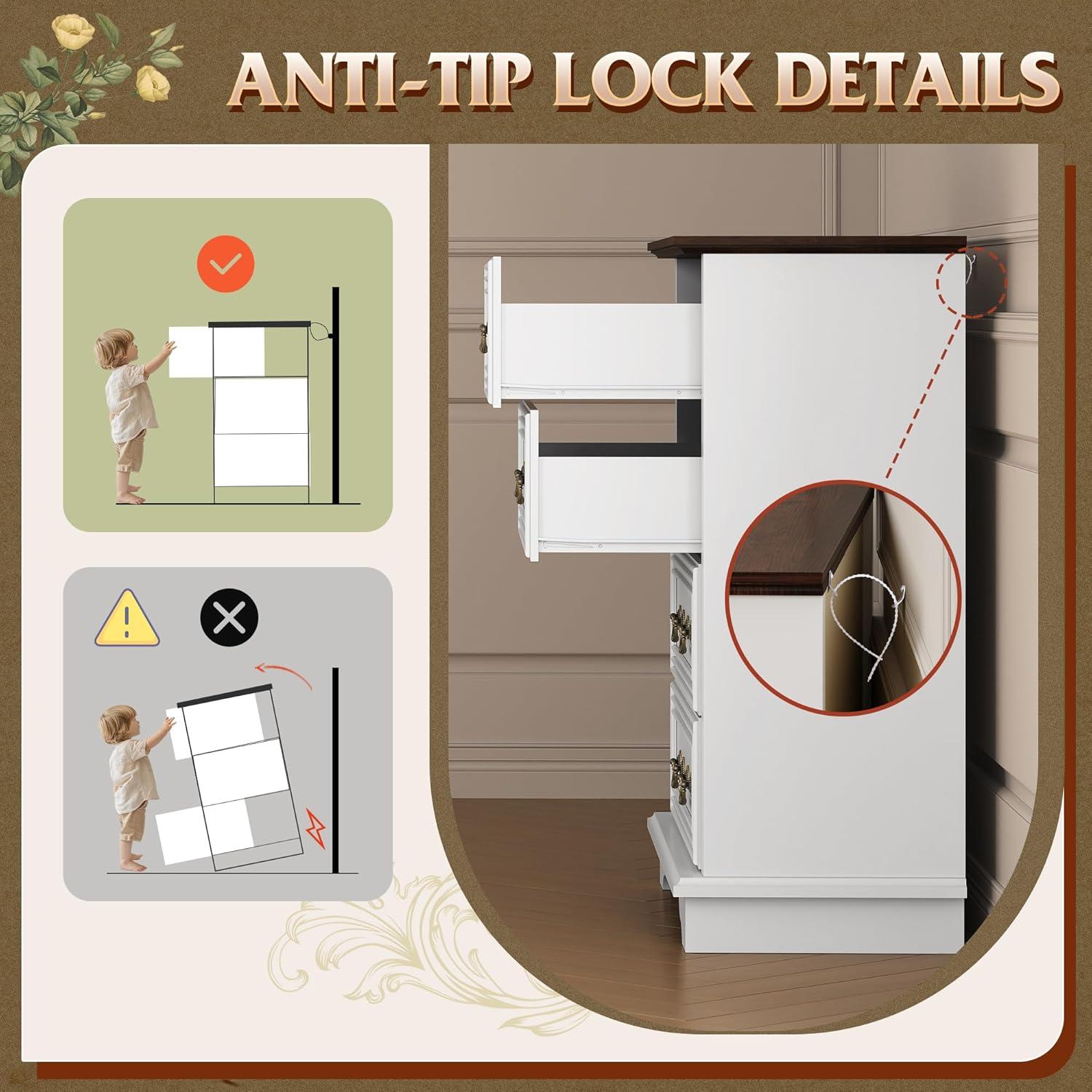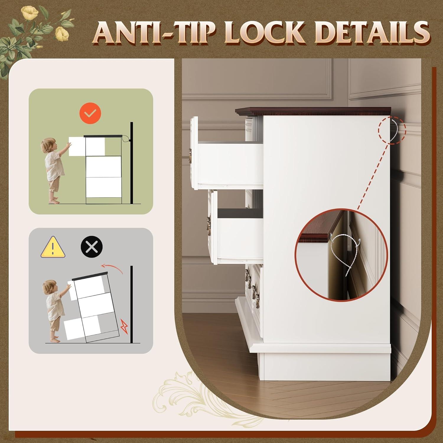 SAFE AND STURDY: The dressers & chests of drawers are made of durable engineered wood, featuring a thick tabletop that can support heavy items. The arched table legs design enhances the stability and durability of the storage cabinet. An anti-tipping device ensures the safety of your family members by preventing wobbling and tipping.
