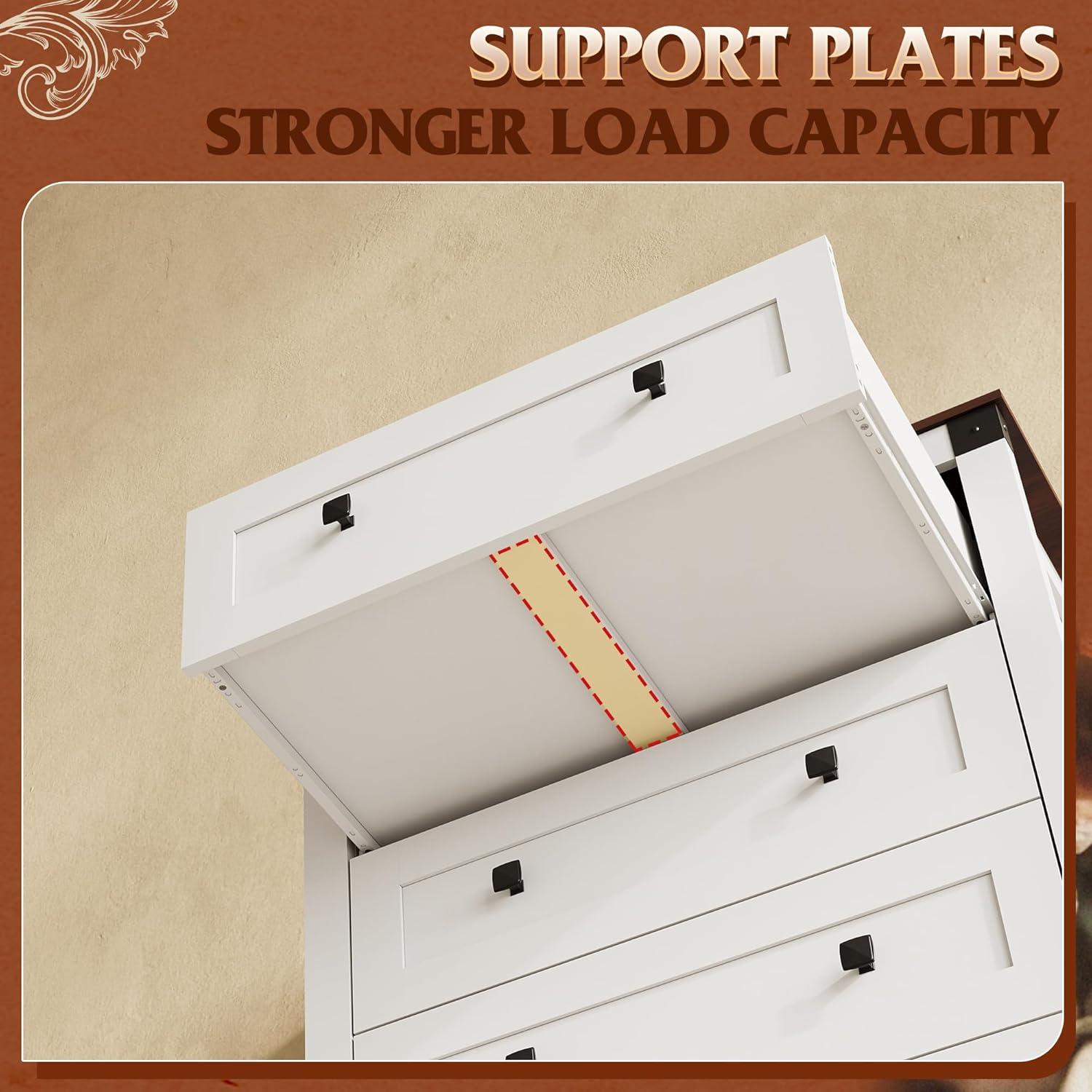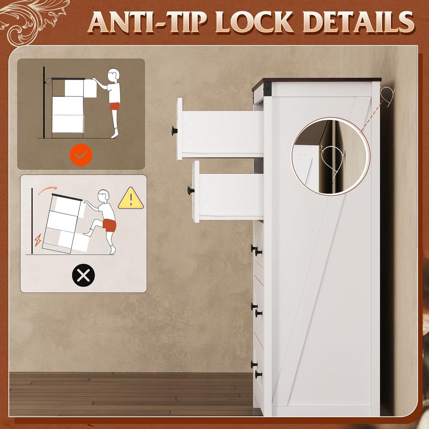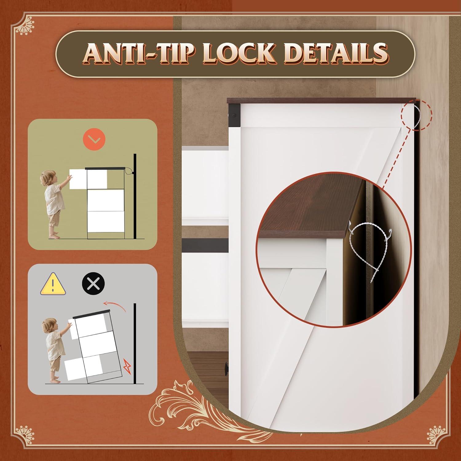 SAFE AND STURDY: The dressers & chests of drawers are made of durable engineered wood, featuring a thick tabletop that can support heavy items. The arched table legs design enhances the stability and durability of the storage cabinet. An anti-tipping device ensures the safety of your family members by preventing wobbling and tipping.