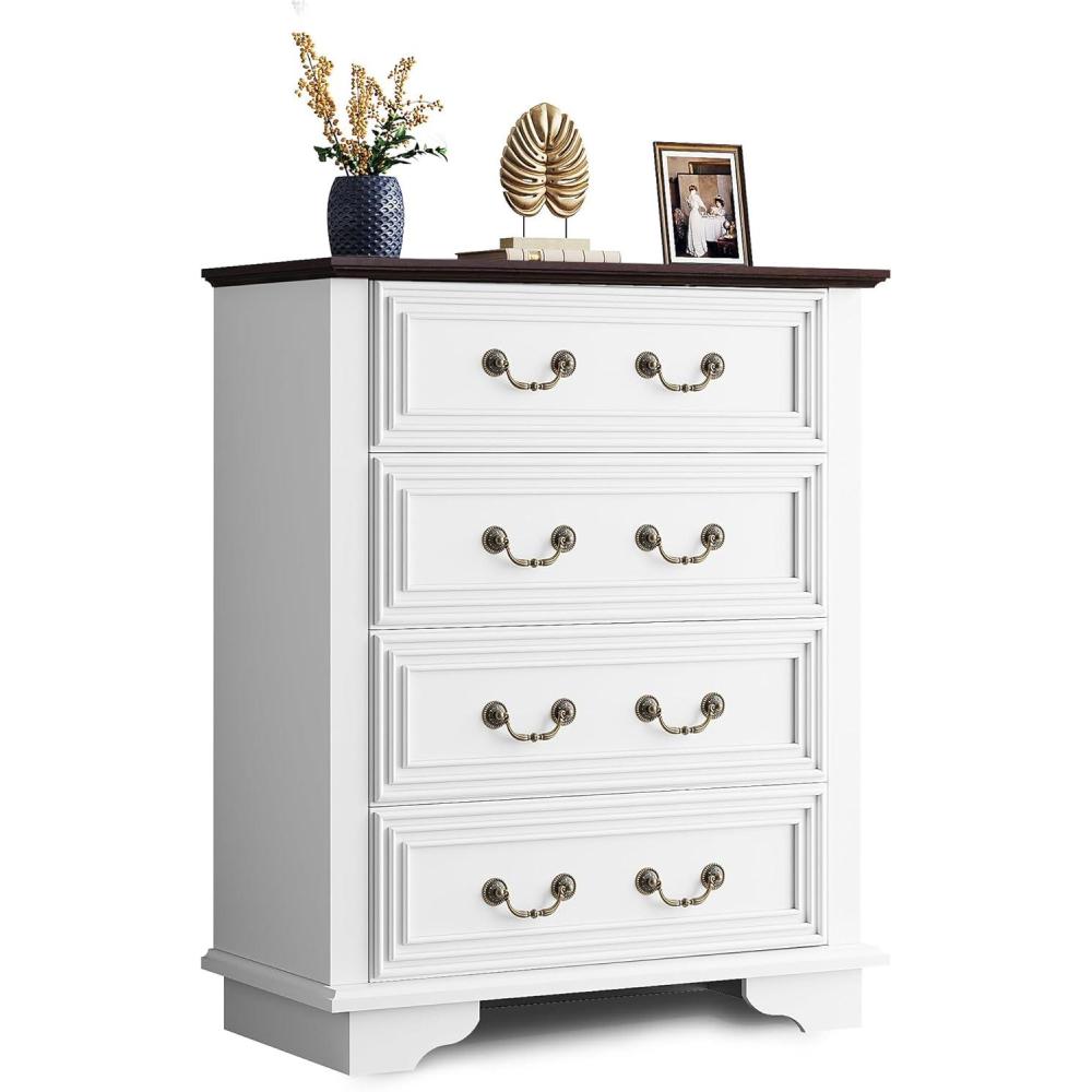 WLIVE Farmhouse Dresser for Bedroom, Black Wood Storge Cabinet with 4 Drawers for Living Room, Hallway, Closet, Tall Retro Nightstand with Roman Metal Handle(White)