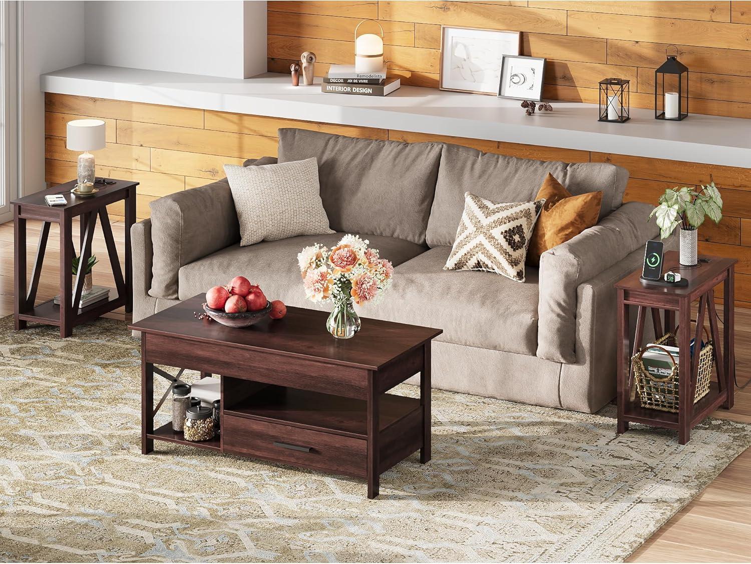 【End Table with Charging Station】The wooden side table has 2 power outlets, 2 USB ports, and a 5-foot power cord for easy charging of phones, computers, and tablets. The two power outlets can be used concurrently