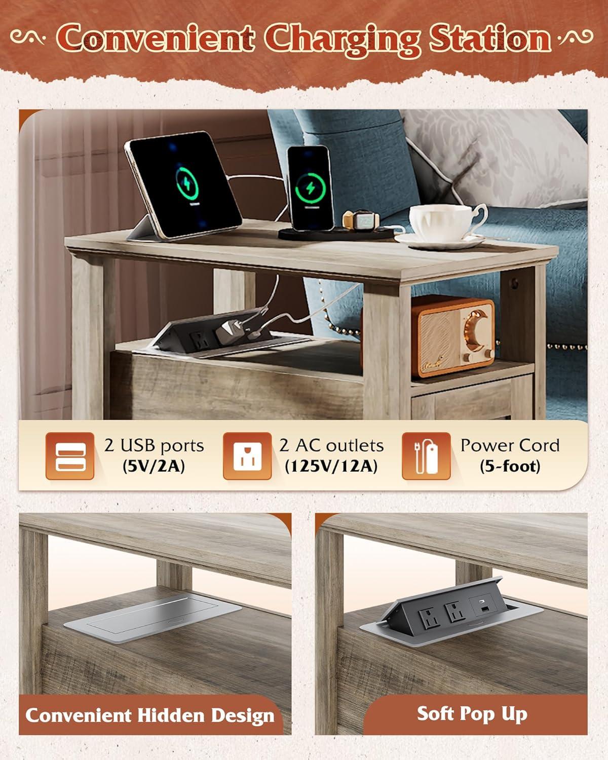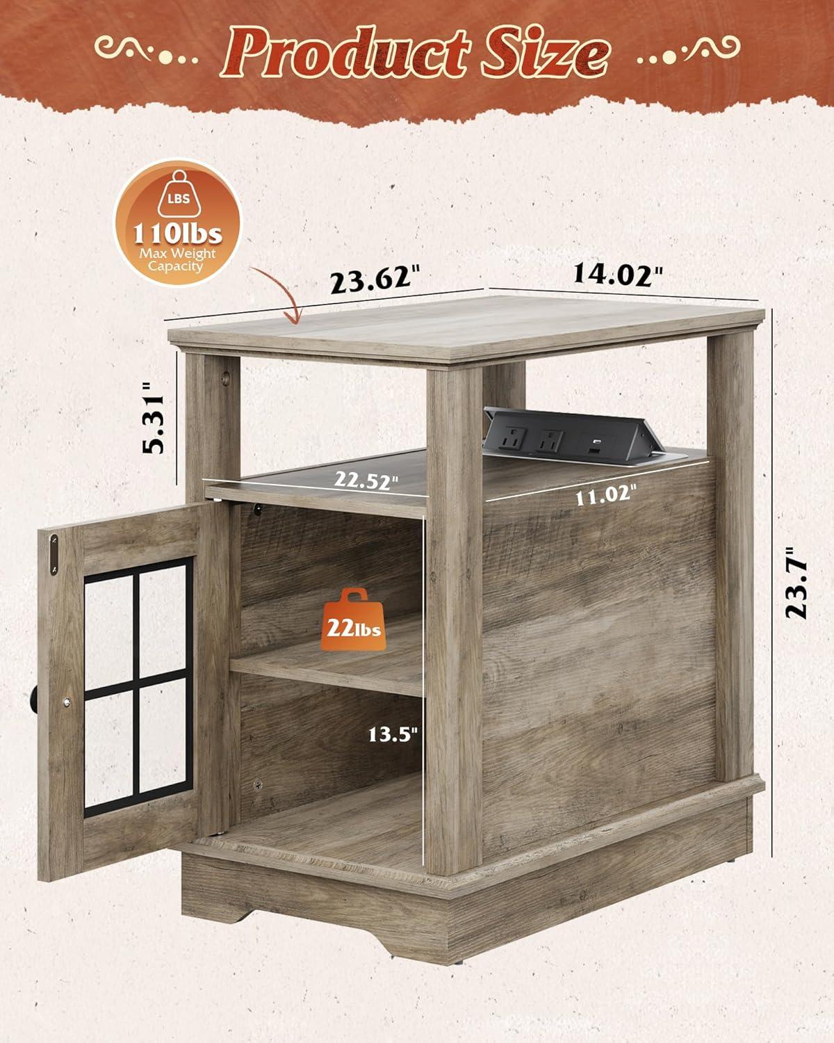 WLIVE Farmhouse End Table with Charging Station, Narrow Side Table for Living Room, Night Stand with Storage, Small Nightstand with USB Ports and Outlets for Bedroom, 23.62" D x 13.98" W x 23.7" H(Greige)