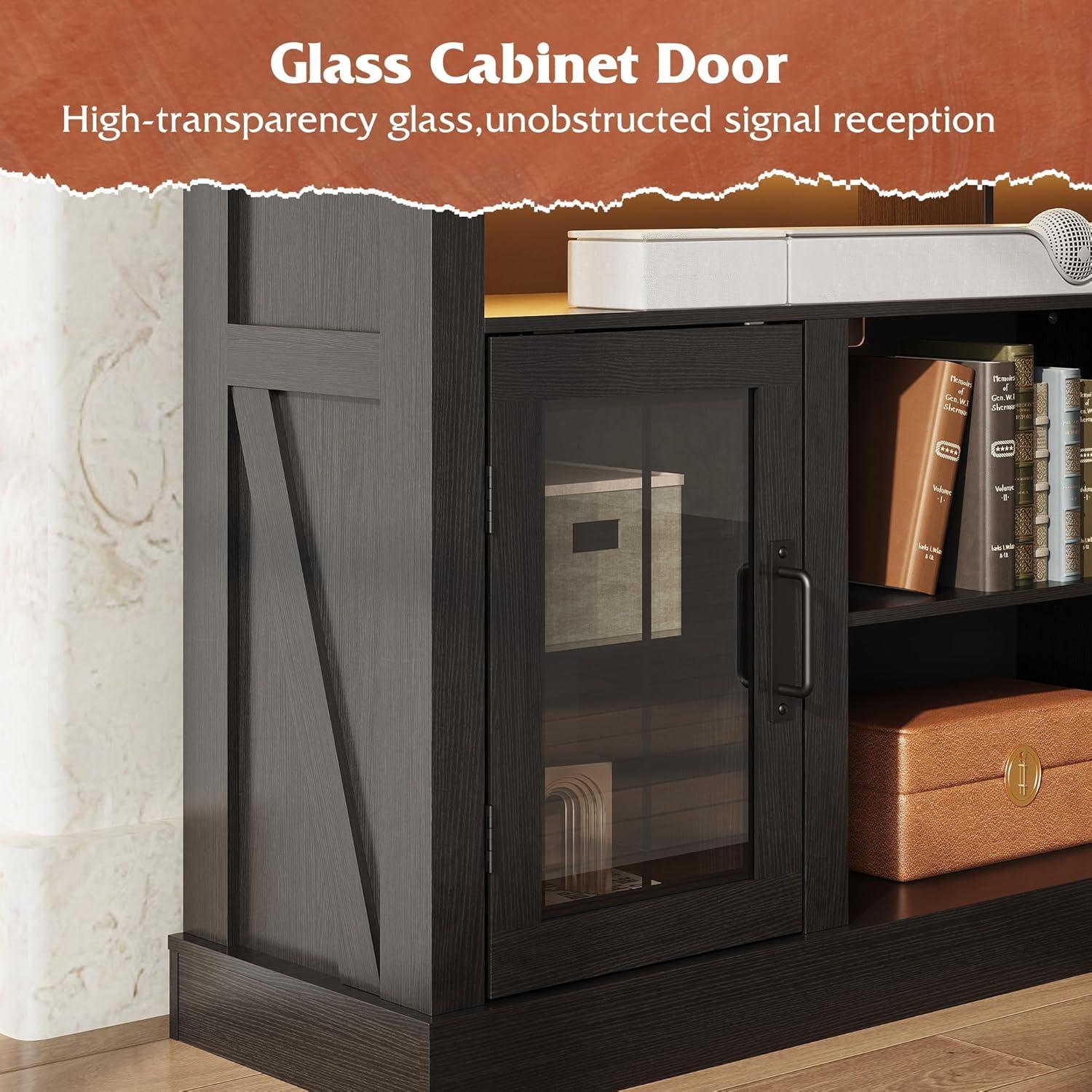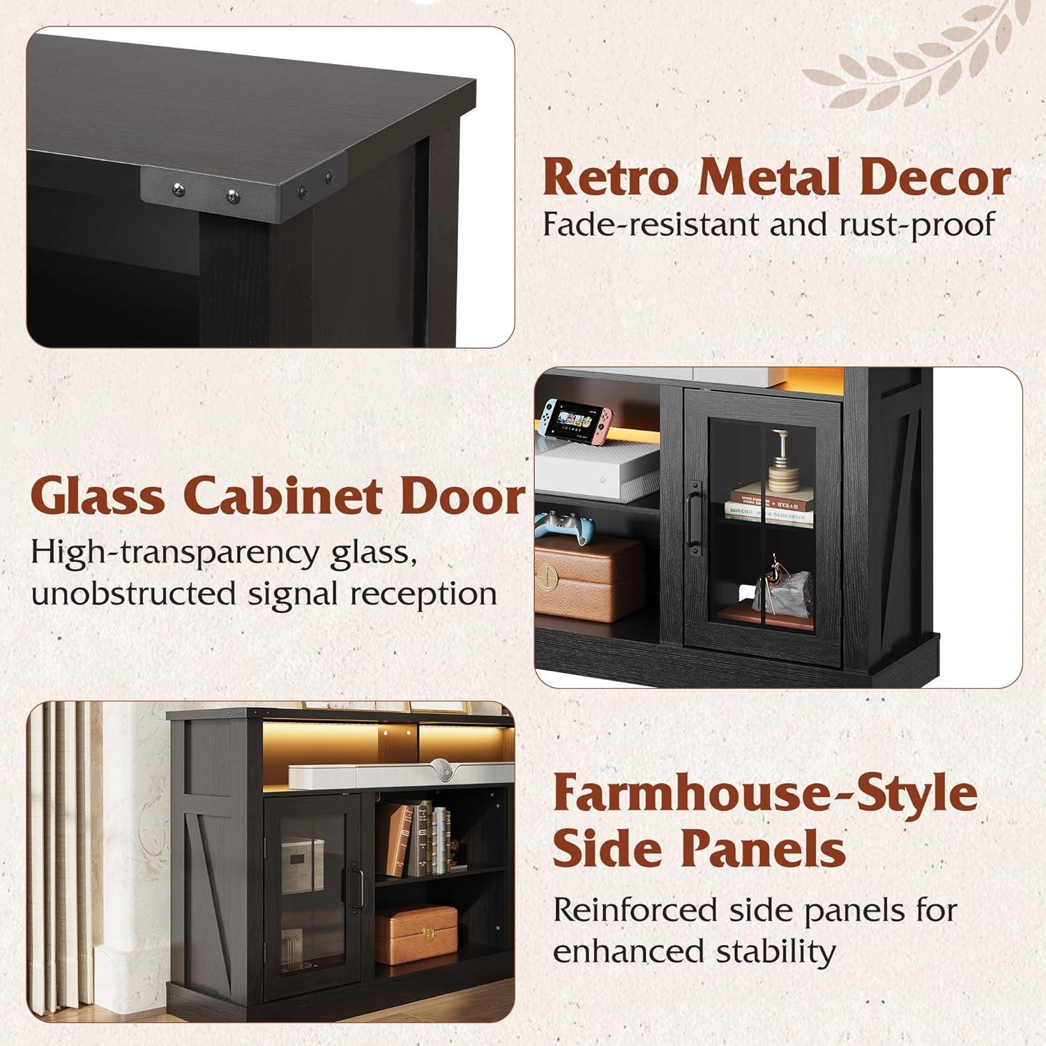 Spacious Organized Storage: Three open shelves and two glass-door cabinets with adjustable shelves provide ample space for gaming gear, PS5, and decor. Six integrated cable holes keep cords neatly hidden for a clean, clutter-free entertainment setup. The spacious top comfortably accommodates TVs up to 65 inches and other daily essentials