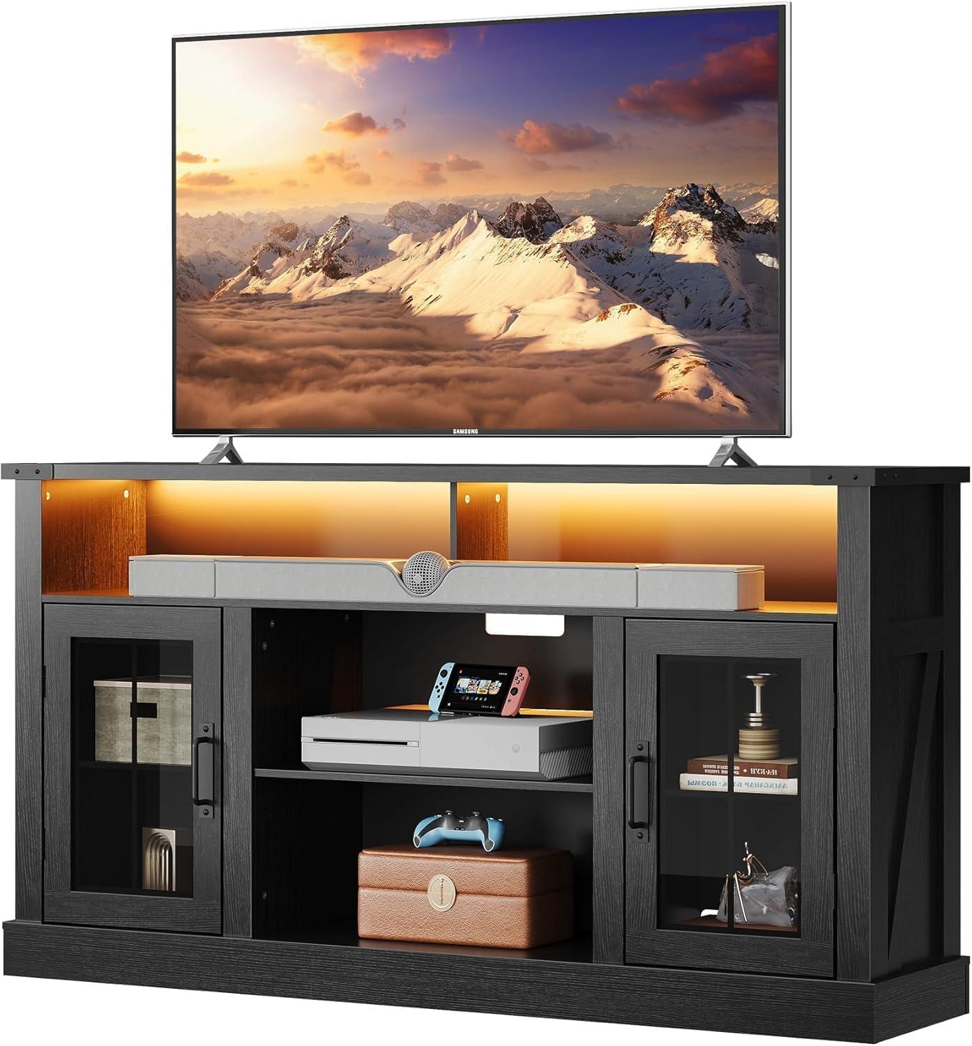 WLIVE Farmhouse TV Stand for 65 Inch TV, Tall Entertainment Center with LED Lights & Storage Cabinets, TV Media Console Table with Adjustable Shelf for Living Room, Bedroom, Home Theater, Black(Black Ebony)