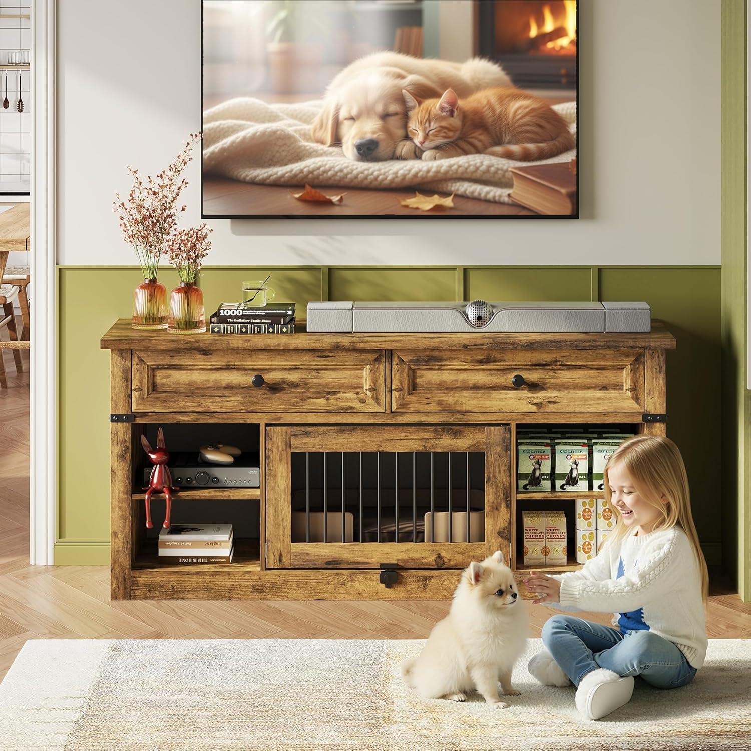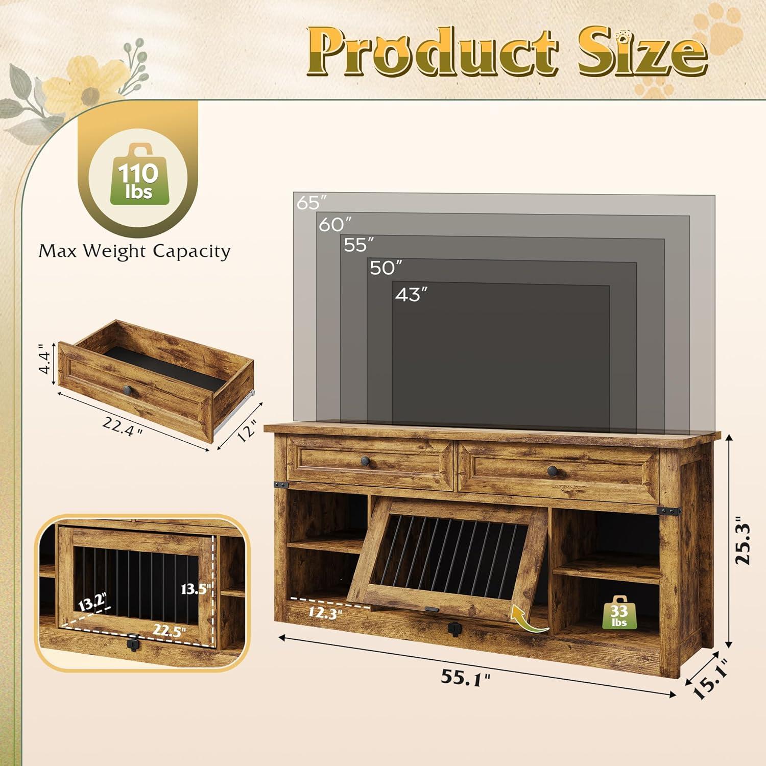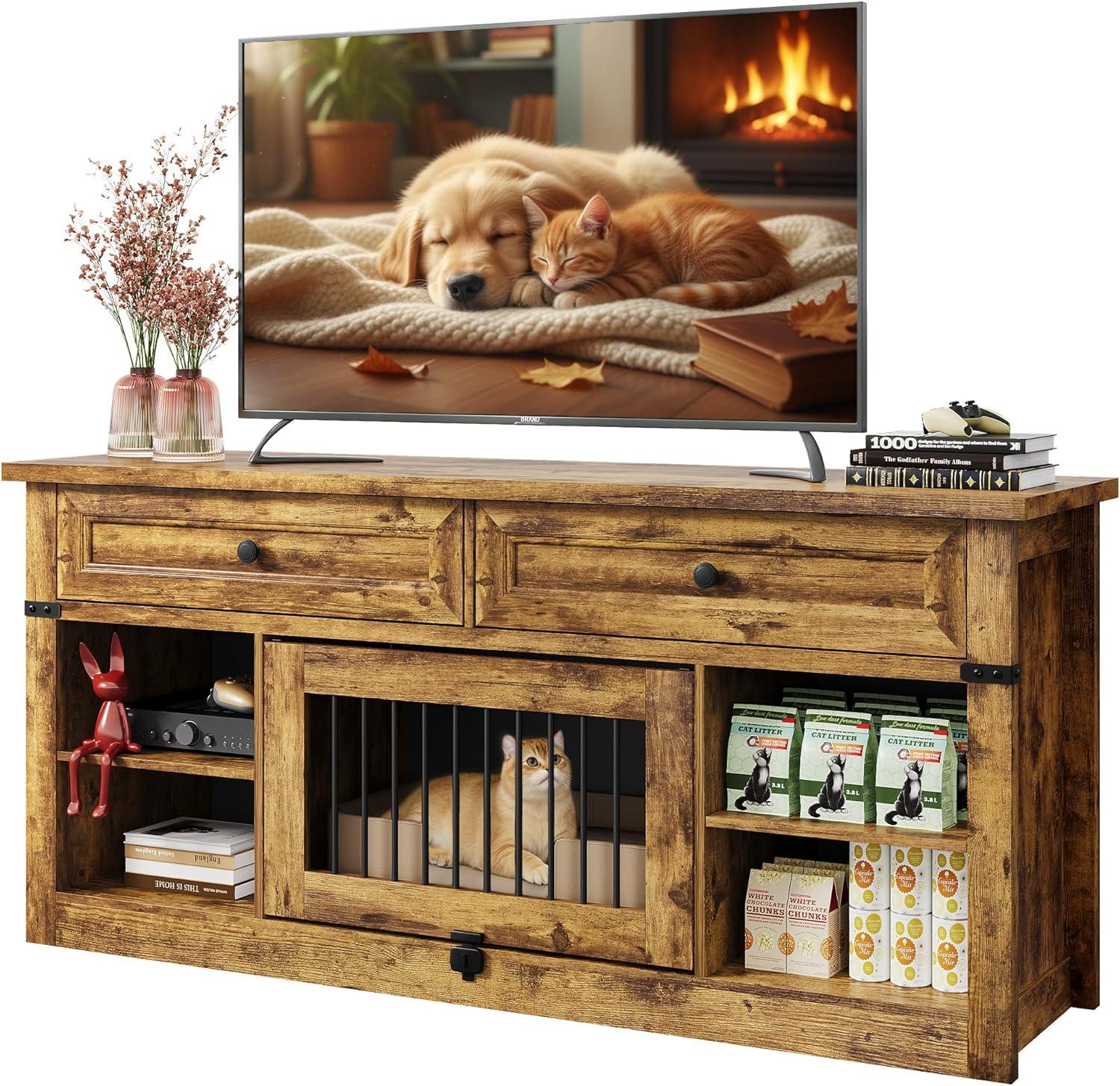 WLIVE Farmhouse TV Stand up to 65 Inch TV with 2 Storage Drawers & Open Shelves, Entertainment Center with Small Dog/Cat House, TV Cabinet for Living Room, Bedroom,Dog Crate Furniture (Milk White)(Retro Brown)