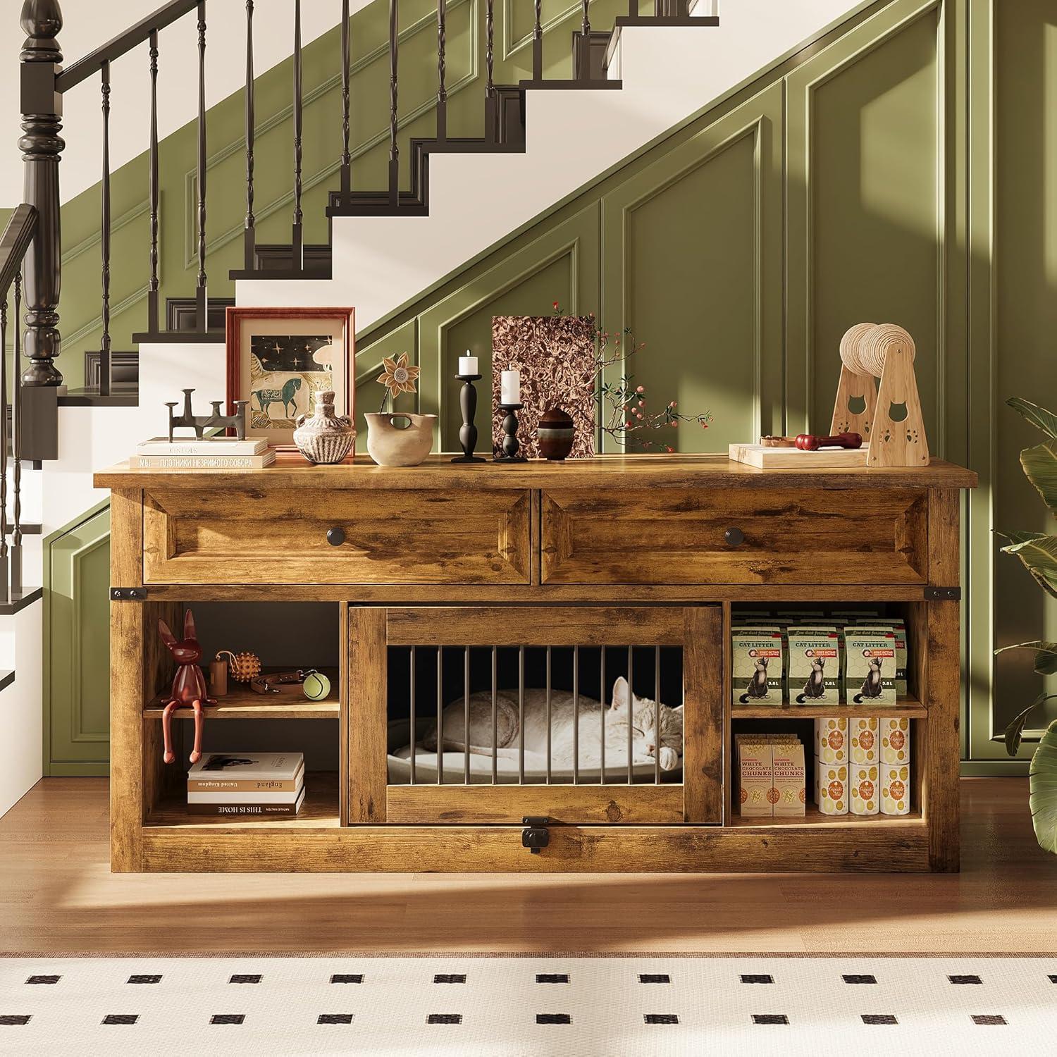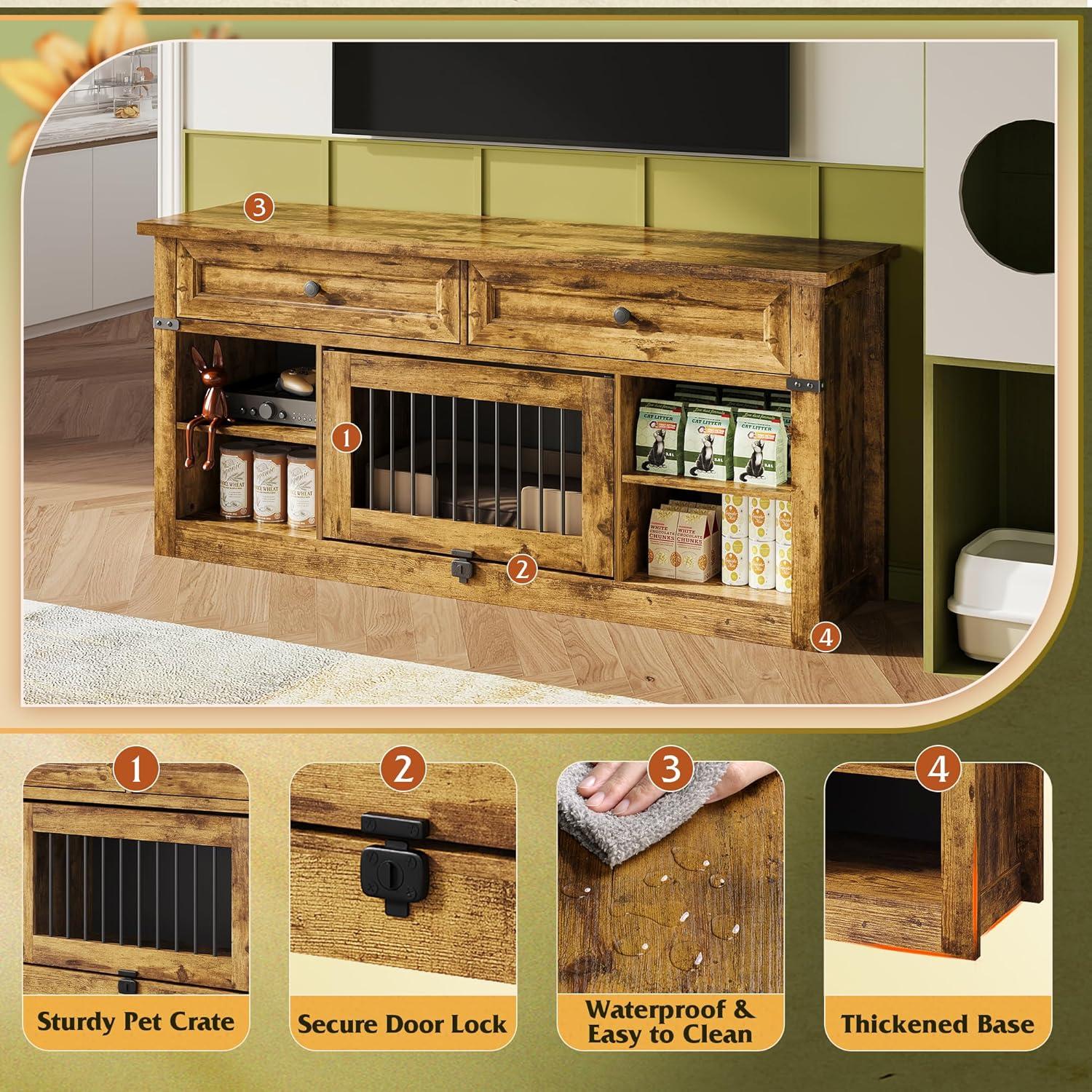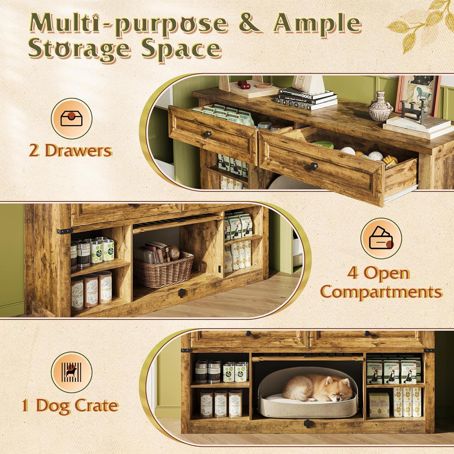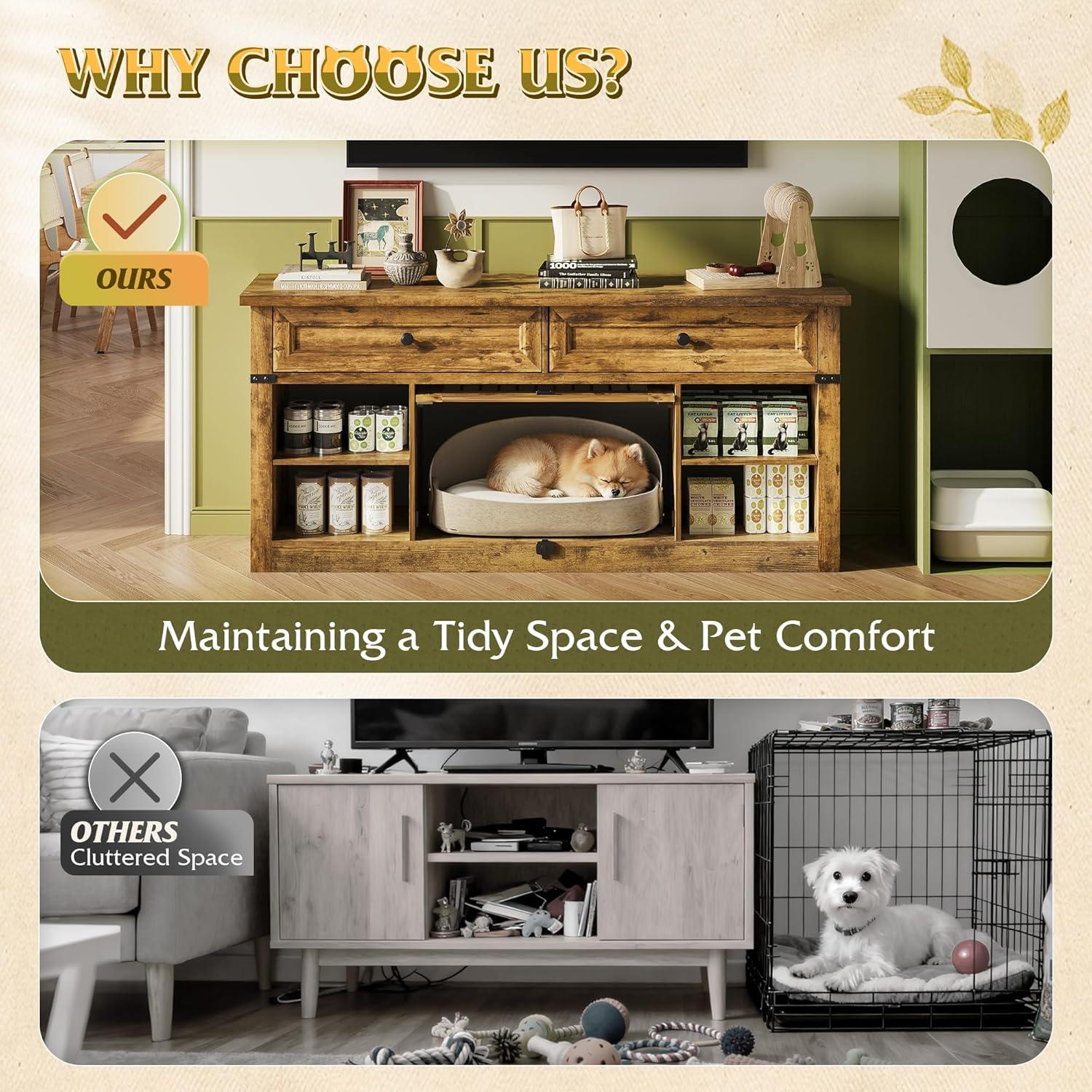 WLIVE Farmhouse TV Stand up to 65 Inch TV with 2 Storage Drawers & Open Shelves, Entertainment Center with Small Dog/Cat House, TV Cabinet for Living Room, Bedroom,Dog Crate Furniture (Milk White)(Retro Brown)